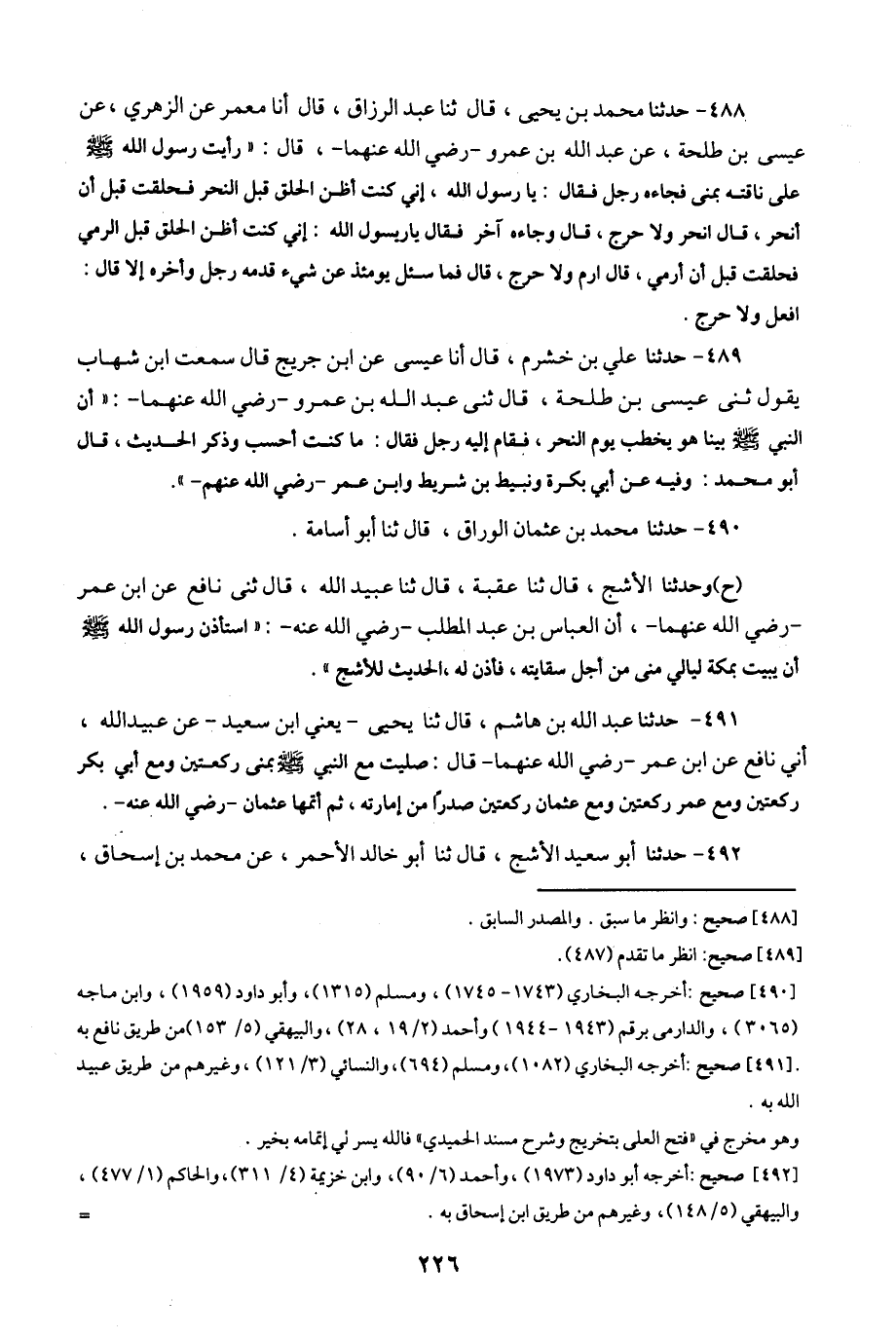 488- حَدَّثَنَا مُحَمَّدُ بْنُ يَحْيَى ، قَالَ : حَدَّثَنَا عَبْدُ الرَّزَّاقِ ، قَالَ : أَخْبَرَنَا مَعْمَرٌ ، عَنِ الزُّهْرِيِّ ، عَنْ عِيسَى بْنِ طَلْحَةَ ، عَنْ عَبْدِ اللهِ بْنِ عَمْرٍو ، رَضِيَ اللَّهُ عَنْهُمَا ، قَالَ : رَأَيْتُ رَسُولَ اللهِ صَلَّى اللَّهُ عَلَيْهِ وَسَلَّمَ عَلَى نَاقَتِهِ بِمِنًى فَجَاءَهُ رَجُلٌ فَقَالَ : يَا رَسُولَ اللهِ إِنِّي كُنْتُ أَظُنُّ الْحَلْقَ قَبْلَ النَّحْرِ فَحَلَقْتُ قَبْلَ أَنْ أَنْحَرَ قَالَ : انْحَرْ وَلاَ حَرَجَ ، قَالَ : وَجَاءَهُ آخَرُ فَقَالَ : يَا رَسُولَ اللهِ : إِنِّي كُنْتُ أَظُنُّ الْحَلْقَ قَبْلَ الرَّمْيِ فَحَلَقْتُ قَبْلَ أَنْ أَرْمِيَ ، قَالَ : ارْمِ وَلاَ حَرَجَ ، قَالَ : فَمَا سُئِلَ يَوْمَئِذٍ عَنْ شَيْءٍ قَدَّمَهُ رَجُلٌ وَأَخَّرَهُ إِلاَّ قَالَ : افْعَلْ وَلاَ حَرَجَ.