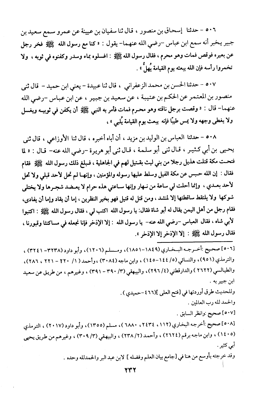 507- حَدَّثَنَا الْحَسَنُ بْنُ مُحَمَّدٍ الزَّعْفَرَانِيُّ ، قَالَ : حَدَّثَنَا عَبِيدَةُ ، يَعْنِي ابْنَ حُمَيْدٍ ، قَالَ : حَدَّثَنِي مَنْصُورُ بْنُ الْمُعْتَمِرِ عَنِ الْحَكَمِ بْنِ عُتَيْبَةَ ، عَنْ سَعِيدِ بْنِ جُبَيْرٍ ، عَنِ ابْنِ عَبَّاسٍ ، رَضِيَ اللَّهُ عَنْهُمَا ، قَالَ : وَقَصَتْ بِرَجُلٍ نَاقَتُهُ وَهُوَ مُحْرِمٌ فَمَاتَ فَأَمَرَ بِهِ النَّبِيُّ صَلَّى اللَّهُ عَلَيْهِ وَسَلَّمَ أَنْ يُكَفَّنَ فِي ثَوْبَيْهِ وَيُغَسَّلَ وَلاَ يُغَطَّى وَجْهُهُ وَلاَ يَمَسَّ طِيبًا فَإِنَّهُ يُبْعَثُ يَوْمَ الْقِيَامَةِ يُلَبِّي.