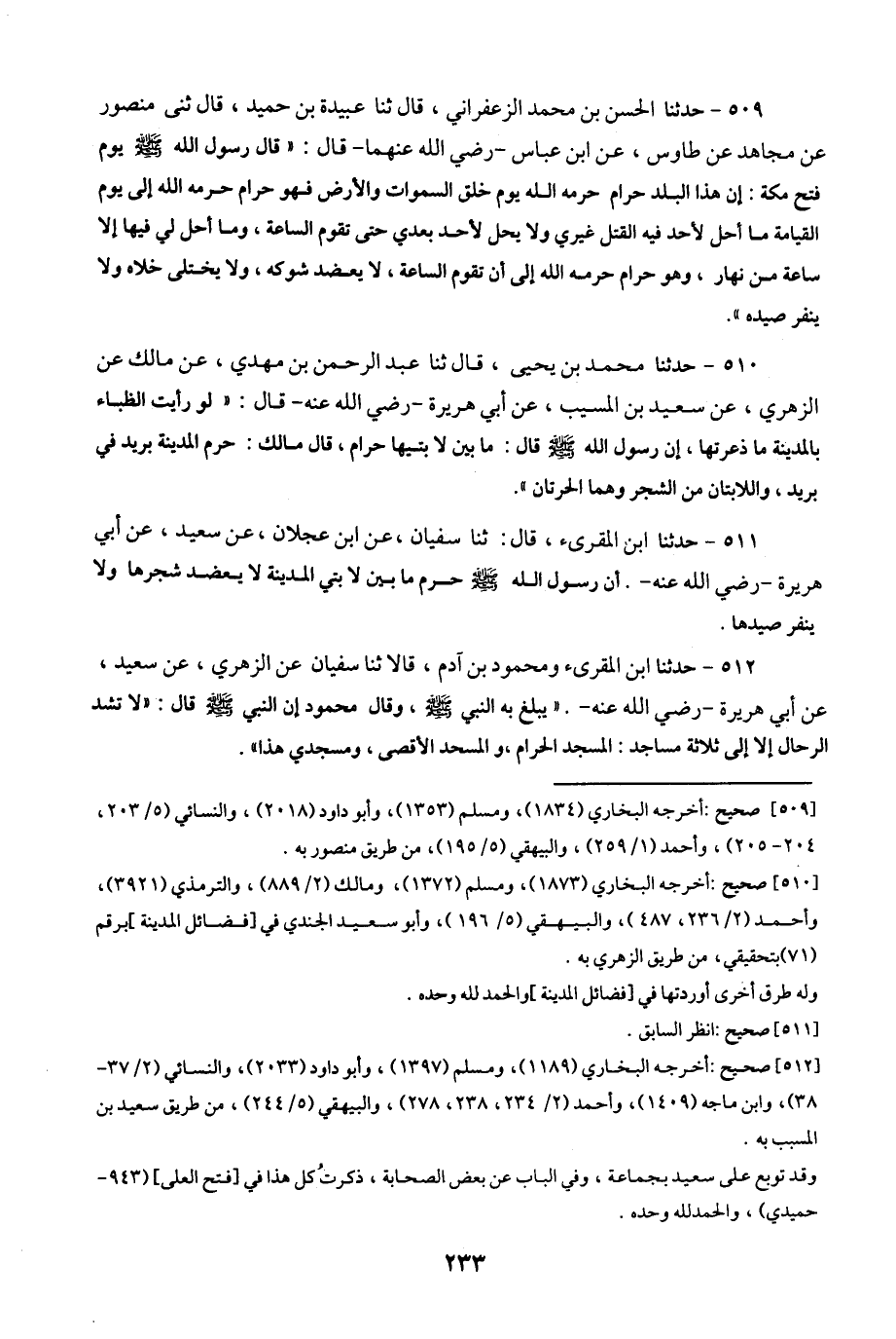 510- حَدَّثَنَا مُحَمَّدُ بْنُ يَحْيَى ، قَالَ : نَا عَبْدُ الرَّحْمَنِ بْنُ مَهْدِيٍّ ، عَنْ مَالِكٍ ، عَنِ الزُّهْرِيِّ ، عَنْ سَعِيدِ بْنِ الْمُسَيَّبِ ، عَنْ أَبِي هُرَيْرَةَ ، رَضِيَ اللَّهُ عَنْهُ ، قَالَ : لَوْ رَأَيْتُ الظِّبَاءَ بِالْمَدِينَةِ مَا ذَعَرْتُهَا إِنَّ رَسُولَ اللهِ صَلَّى اللَّهُ عَلَيْهِ وَسَلَّمَ قَالَ : مَا بَيْنَ لاَبَتَيْهَا حَرَامٌ ، قَالَ مَالِكٌ : حَرَمُ الْمَدِينَةِ بَرِيدٌ فِي بَرِيدٍ ، وَاللاَّبَتَانِ مِنَ الشَّجَرِ وَهُمَا الْحَرَّتَانِ.