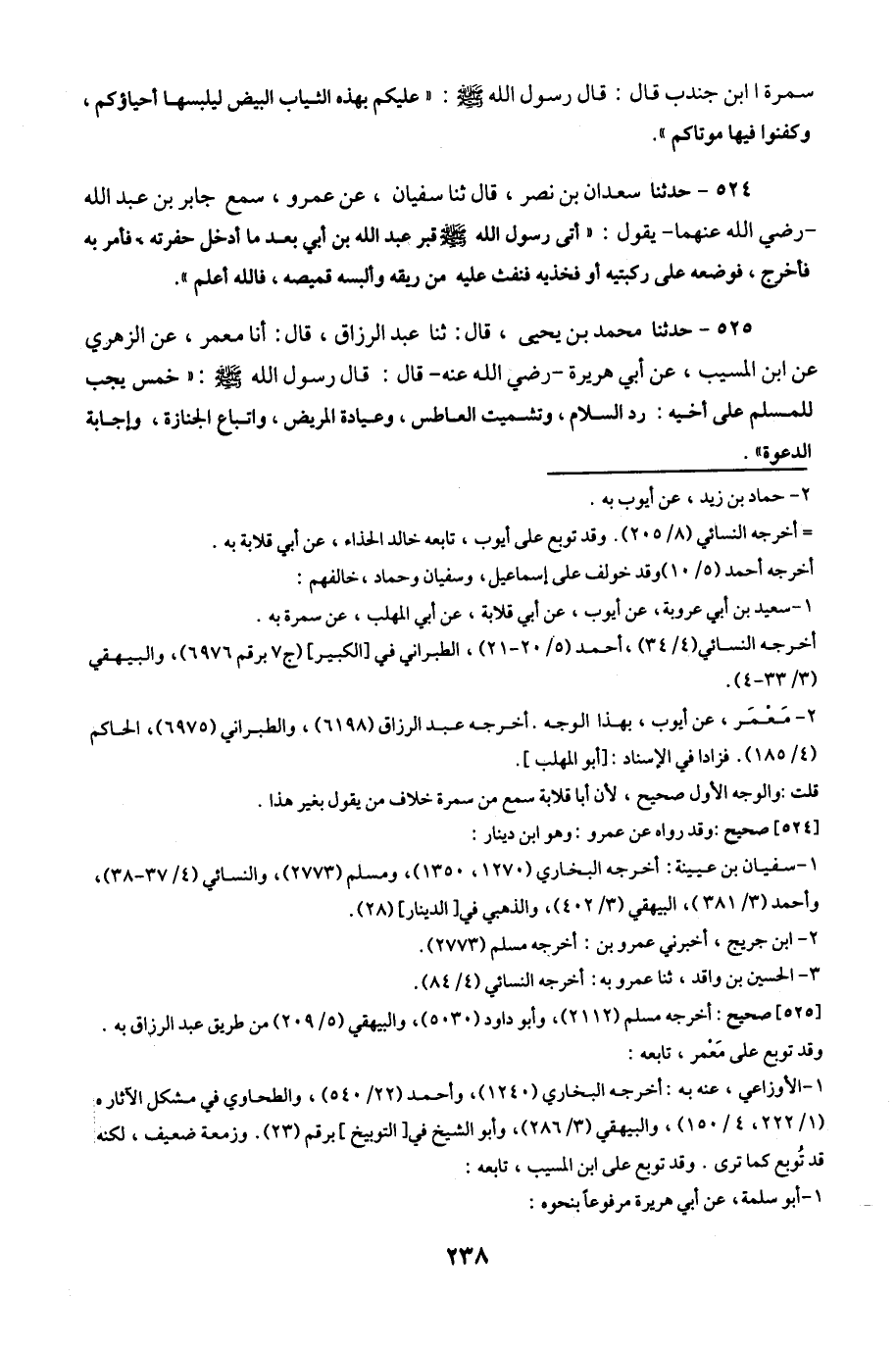 525- حَدَّثَنَا مُحَمَّدُ بْنُ يَحْيَى ، قَالَ : حَدَّثَنَا عَبْدُ الرَّزَّاقِ ، قَالَ : أَخْبَرَنَا مَعْمَرٌ ، عَنِ الزُّهْرِيِّ ، عَنِ ابْنِ الْمُسَيَّبِ ، عَنْ أَبِي هُرَيْرَةَ ، رَضِيَ اللَّهُ عَنْهُ ، قَالَ : قَالَ رَسُولُ اللهِ صَلَّى اللَّهُ عَلَيْهِ وَسَلَّمَ : خَمْسٌ يَجِبُ لِلْمُسْلِمِ عَلَى أَخِيهِ : رَدُّ السَّلاَمِ وَتَشْمِيتُ الْعَاطِسِ وَعِيَادَةُ الْمَرِيضِ وَاتِّبَاعُ الْجَِنَازَةِ وَإِجَابَةُ الدَّعْوَةِ.