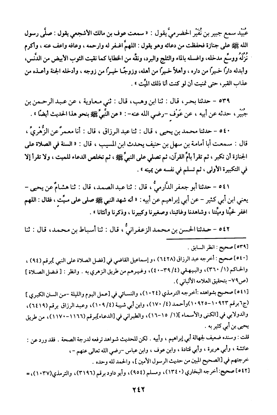 540- حَدَّثَنَا مُحَمَّدُ بْنُ يَحْيَى ، قَالَ : حَدَّثَنَا عَبْدُ الرَّزَّاقِ ، قَالَ : أَخْبَرَنَا مَعْمَرٌ ، عَنِ الزُّهْرِيِّ ، قَالَ : سَمِعْتُ أَبَا أُمَامَةَ بْنَ سَهْلِ بْنِ حُنَيْفٍ ، يُحَدِّثُ ابْنَ الْمُسَيَّبِ قَالَ : السُّنَّةُ فِي الصَّلاَةِ عَلَى الْجَِنَازَةِ أَنْ تُكَبِّرَ ، ثُمَّ تَقْرَأَ بِأُمِّ الْقُرْآنِ ، ثُمَّ تُصَلِّي عَلَى النَّبِيِّ صَلَّى اللَّهُ عَلَيْهِ وَسَلَّمَ ، ثُمَّ تُخْلِصَ الدُّعَاءَ لِلْمَيِّتِ وَلاَ تَقْرَأْ إِلاَّ فِي التَّكْبِيرَةِ الأُولَى ، ثُمَّ يُسَلَّمَ فِي نَفْسِهِ عَنْ يَمِينِهِ.