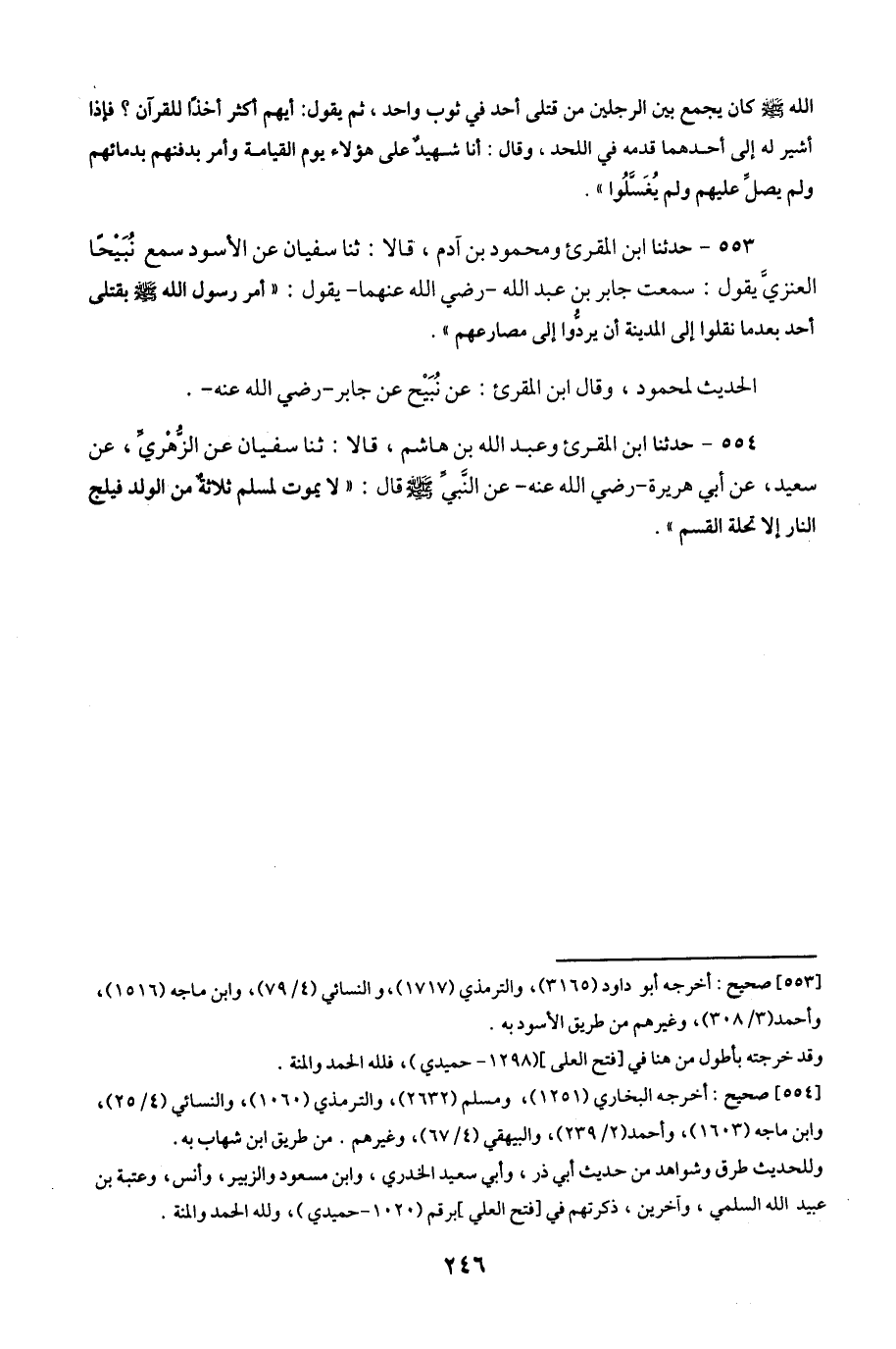 553- حَدَّثَنَا ابْنُ الْمُقْرِئِ ، وَمَحْمُودُ بْنُ آدَمَ ، قَالاَ : حَدَّثَنَا سُفْيَانُ ، عَنِ الأَسْوَدِ ، سَمِعَ نُبَيْحًا الْعَنَزِيَّ ، يَقُولُ : سَمِعْتُ جَابِرَ بْنَ عَبْدِ اللهِ ، رَضِيَ اللَّهُ عَنْهُمَا يَقُولُ : أَمَرَ رَسُولُ اللهِ صَلَّى اللَّهُ عَلَيْهِ وَسَلَّمَ بِقَتْلَى أُحُدٍ بَعْدَمَا نُقِلُوا إِلَى الْمَدِينَةِ أَنْ يُرَدُّوا إِلَى مَصَارِعِهِمْ.