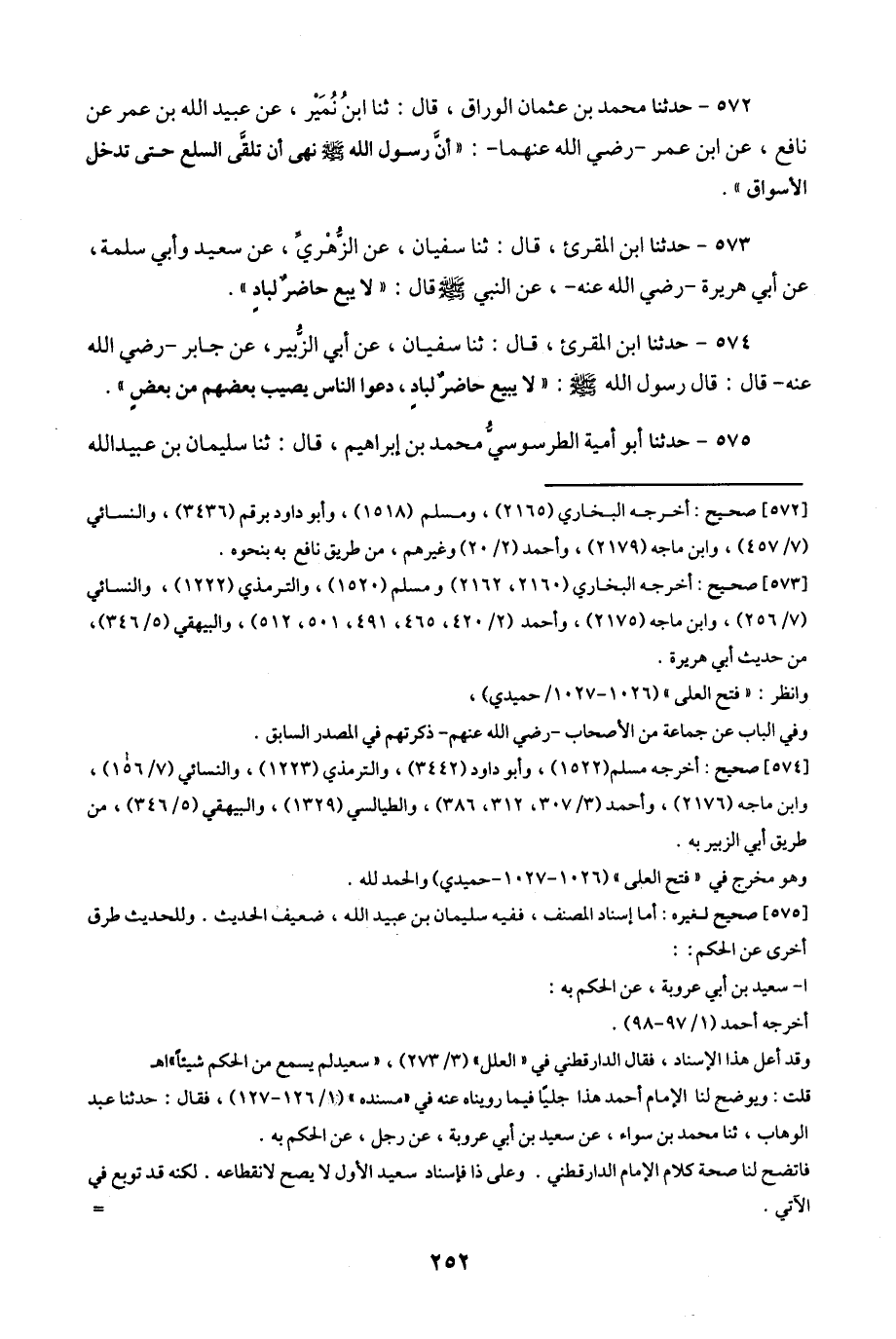 572- حَدَّثَنَا مُحَمَّدُ بْنُ عُثْمَانَ الْوَرَّاقُ ، قَالَ : حَدَّثَنَا ابْنُ نُمَيْرٍ ، عَنْ عُبَيْدِ اللهِ بْنِ عُمَرَ ، عَنْ نَافِعٍ ، عَنِ ابْنِ عُمَرَ ، رَضِيَ اللَّهُ عَنْهُمَا أَنَّ رَسُولَ اللهِ صَلَّى اللَّهُ عَلَيْهِ وَسَلَّمَ نَهَى أَنْ تُلَقَّى السِّلَعُ حَتَّى تَدْخُلَ الأَسْوَاقَ.