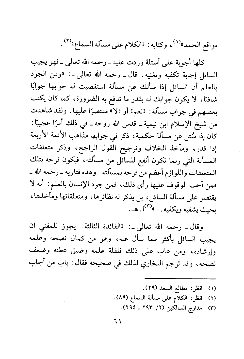 كلها أجوبة على أسئلة وردت عليه - رحمه الله تعالى - فهو يجيب السائل إجابة تكفيه وتغنيه. قال - رحمه الله تعالى -: "ومن الجود بالعلم أن السائل إذا سألك عن مسألة استقصيت له جوابها جوابًا شافيًا، لا يكون جوابك له بقدر ما تدفع به الضرورة، كما كان يكتب بعضهم في جواب مسألة: "نعم" أو "لا" مقتصرًا عليها. ولقد شاهدت من شيخ الإسلام ابن تيمية - قدس الله روحه - في ذلك أمرًا عجيبًا: كان إذا سُئل عن مسألة حكمية، ذكر في جوابها مذاهب الأئمة الأربعة إذا قدر، ومأخذ الخلاف وترجيح القول الراجح، وذكر متعلقات المسألة التي ربما تكون أنفع للسائل من مسألته، فيكون فرحه بتلك المتعلقات واللوازم أعظم من فرحه بمسألته. وهذه فتاويه - رحمه الله - فمن أحب الوقوف عليها رأى ذلك، فمن جود الإنسان بالعلم: أنه لا يقتصر على مسألة السائل، بل يذكر له نظائرها، ومتعلقاتها ومآخذها، بحيث يشفيه ويكفيه .. " (¬3) ا. هـ.