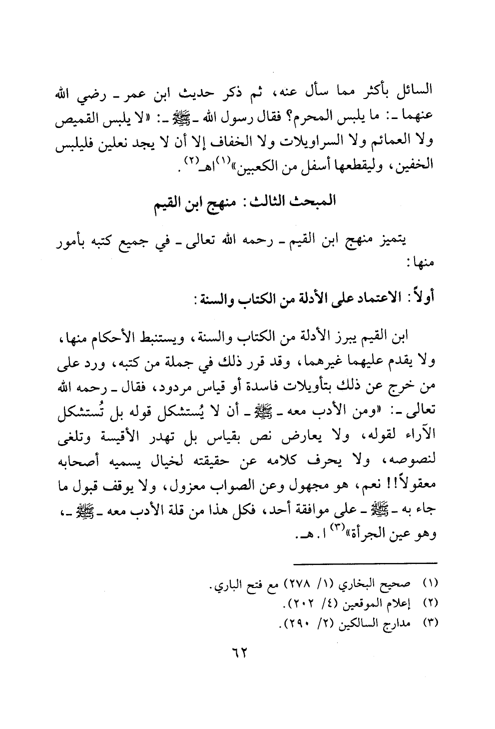 ابن القيم يبرز الأدلة من الكتاب والسنة، ويستنبط الأحكام منها، ولا يقدم عليهما غيرهما، وقد قرر ذلك في جملة من كتبه، ورد على من خرج عن ذلك بتأويلات فاسدة أو قياس مردود، فقال - رحمه الله تعالى -: "ومن الأدب معه - صلى الله عليه وسلم - ن لا يُستشكل قوله بل تُستشكل الآراء لقوله، ولا يعارض نص بقياس بل تهدر الأقيسة وتلغى لنصوصه، ولا يحرف كلامه عن حقيقته لخيال يسميه أصحابه معقولًا!! نعم، هو مجهول وعن الصواب معزول، ولا يوقف قبول ما جاء به - صلى الله عليه وسلم - على موافقة أحد، فكل هذا من قلة الأدب معه - صلى الله عليه وسلم -، وهو عين الجرأة" (¬3) ا. هـ.