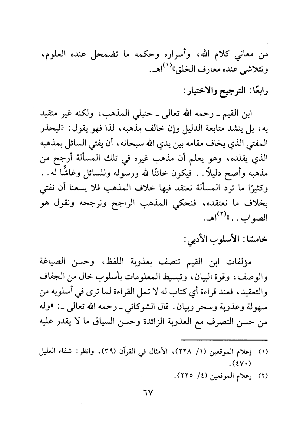 ابن القيم - رحمه الله تعالى - حنبلي المذهب، ولكنه غير متقيد به، بل ينشد متابعة الدليل وإن خالف مذهبه، لذا فهو يقول: "ليحذر المفتي الذي يخاف مقامه بين يدي الله سبحانه، أن يفتي السائل بمذهبه الذي يقلده، وهو يعلم أن مذهب غيره في تلك المسألة أرجح من مذهبه وأصح دليلًا .. فيكون خائنًا لله ورسوله وللسائل وغاشًّا له .. وكثيرًا ما ترد المسألة نعتقد فيها خلاف المذهب فلا يسعنا أن نفتي بخلاف ما نعتقده، فنحكي المذهب الراجح ونرجحه ونقول هو الصواب .. " (¬2) اهـ.
