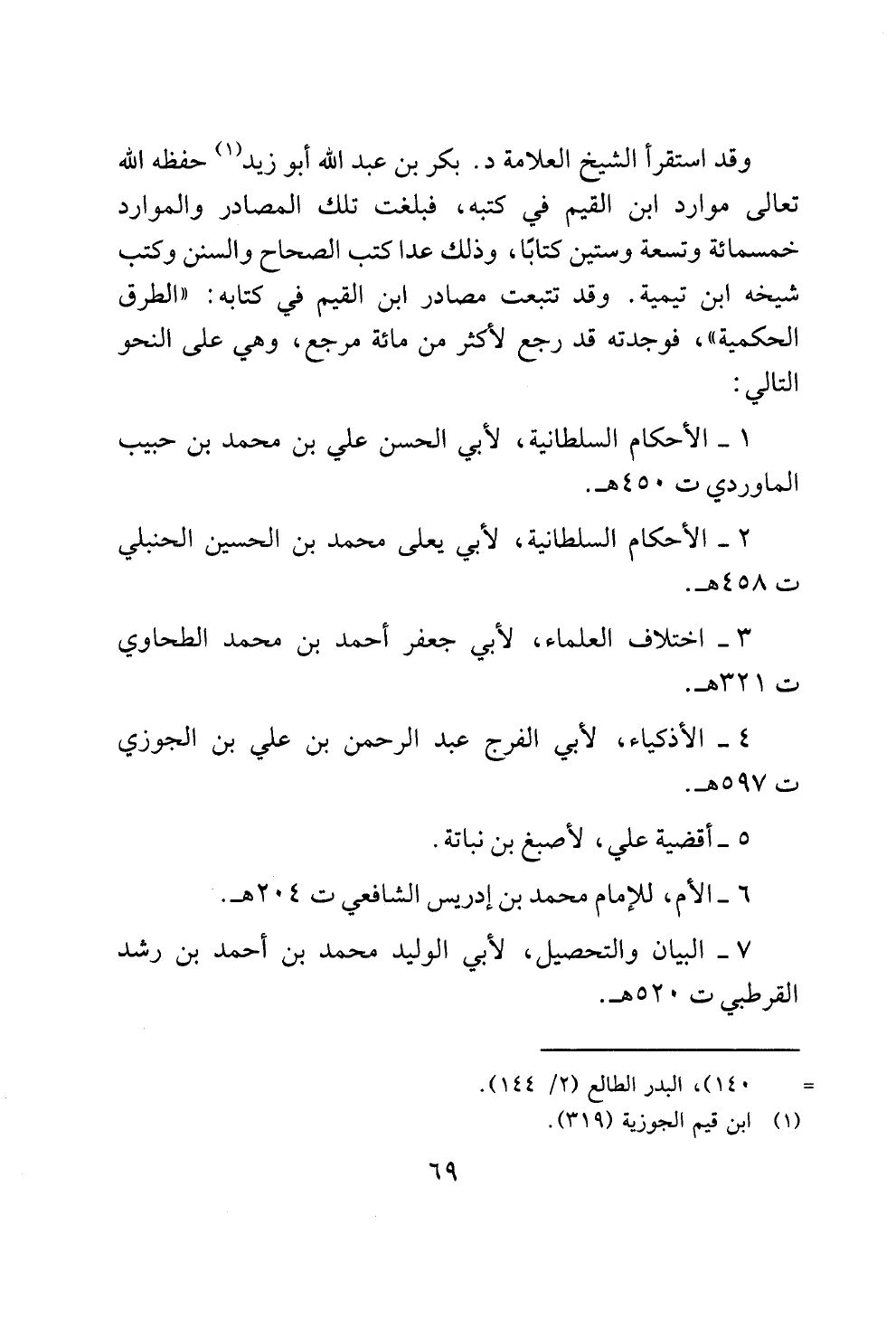 وقد استقرأ الشيخ العلامة د. بكر بن عبد الله أبو زيد (¬1) حفظه الله تعالى موارد ابن القيم في كتبه، فبلغت تلك المصادر والموارد خمسمائة وتسعة وستين كتابًا، وذلك عدا كتب الصحاح والسنن وكتب شيخه ابن تيمية. وقد تتبعت مصادر ابن القيم في كتابه: "الطرق الحكمية"، فوجدته قد رجع لأكثر من مائة مرجع، وهي على النحو التالي: