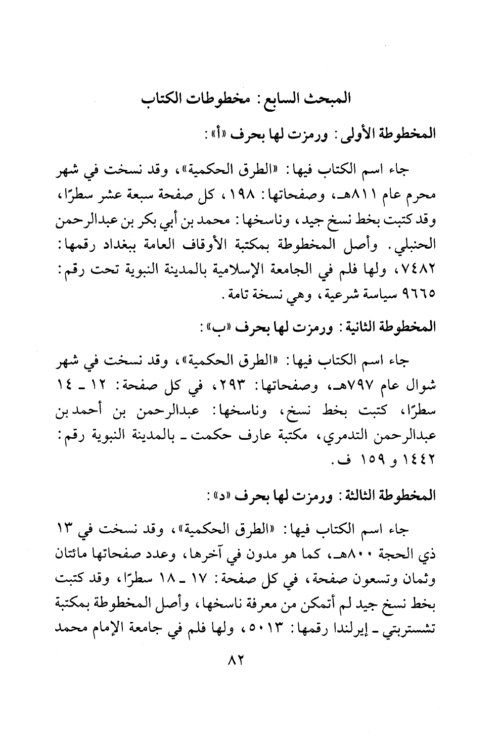 جاء اسم الكتاب فيها: "الطرق الحكمية"، وقد نسخت في شهر شوال عام 797 هـ، وصفحاتها: 293، في كل صفحة: 12 - 14 سطرًا، كتبت بخط نسخ، وناسخها: عبد الرحمن بن أحمد بن عبد الرحمن التدمري، مكتبة عارف حكمت - بالمدينة النبوية رقم: 1442 و 159 ف.