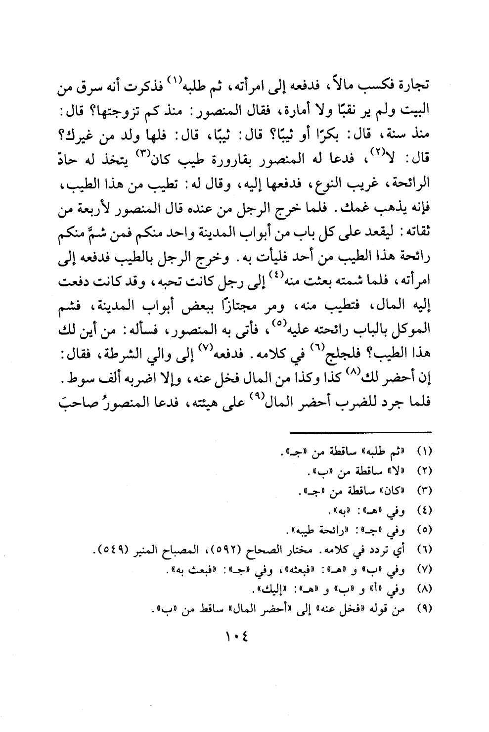 تجارة فكسب مالًا، فدفعه إلى امرأته، ثم طلبه (¬1) فذكرت أنه سرق من البيت ولم ير نقبًا ولا أمارة، فقال المنصور: منذ كم تزوجتها؟ قال: منذ سنة، قال: بكرًا أو ثيبًا؟ قال: ثيبًا، قال: فلها ولد من غيرك؟ قال: لا (¬2)، فدعا له المنصور بقارورة طيب كان (¬3) يتخذ له حادّ الرائحة، غريب النوع، فدفعها إليه، وقال له: تطيب من هذا الطيب، فإنه يذهب غمك. فلما خرج الرجل من عنده قال المنصور لأربعة من ثقاته: ليقعد على كل باب من أبواب المدينة واحد منكم فمن شمَّ منكم رائحة هذا الطيب من أحد فليأت به. وخرج الرجل بالطيب فدفعه إلى امرأته، فلما شمته بعثت منه (¬4) إلى رجل كانت تحبه، وقد كانت دفعت إليه المال، فتطيب منه، ومر مجتازًا ببعض أبواب المدينة، فشم الموكل بالباب رائحته عليه (¬5)، فأتى به المنصور، فسأله: من أين لك هذا الطيب؟ فلجلج (¬6) في كلامه. فدفعه (¬7) إلى والي الشرطة، فقال: إن أحضر لك (¬8) كذا وكذا من المال فخل عنه، وإلا اضربه ألف سوط. فلما جرد للضرب أحضر المال (¬9) على هيئته، فدعا المنصورُ صاحبَ