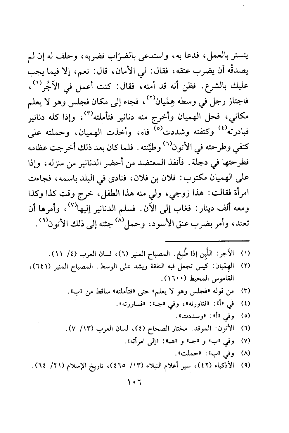 يتستر بالعمل، فدعا به، واستدعى بالضرّاب فضربه، وحلف له إن لم يصدقْه أن يضرب عنقه، فقال: لي الأمان، قال: نعم، إلا فيما يجب عليك بالشرع. فظن أنه قد أمنه، فقال: كنت أعمل في الآجُر (¬1)، فاجتاز رجل في وسطه هِمْيان (¬2)، فجاء إلى مكان فجلس وهو لا يعلم مكاني، فحل الهميان وأخرج منه دنانير فتأملته (¬3)، وإذا كله دنانير فبادرته (¬4) وكتفته وشددت (¬5) فاه، وأخذت الهميان، وحملته على كتفي وطرحته في الأتون (¬6) وطيَّنته. فلما كان بعد ذلك أخرجت عظامه فطرحتها في دجلة. فأنفذ المعتضد من أحضر الدنانير من منزله، وإذا على الهميان مكتوب: فلان بن فلان، فنادى في البلد باسمه، فجاءت امرأة فقالت: هذا زوجي، ولي منه هذا الطفل، خرج وقت كذا وكذا ومعه ألف دينار: فغاب إلى الآن. فسلم الدنانير إليها (¬7)، وأمرها أن تعتد، وأمر بضرب عنق الأسود، وحمل (¬8) جثته إلى ذلك الأتون (¬9).