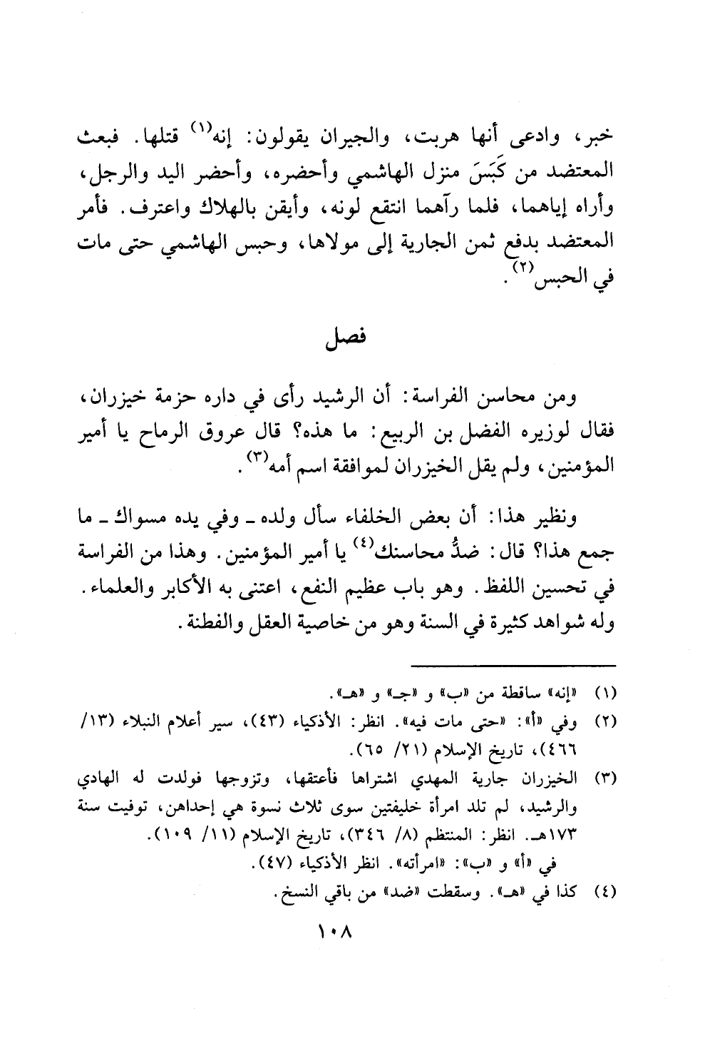 ومن محاسن الفراسة: أن الرشيد رأى في داره حزمة خيزران، فقال لوزيره الفضل بن الربيع: ما هذه؟ قال عروق الرماح يا أمير المؤمنين، ولم يقل الخيزران لموافقة اسم أمه (¬3).