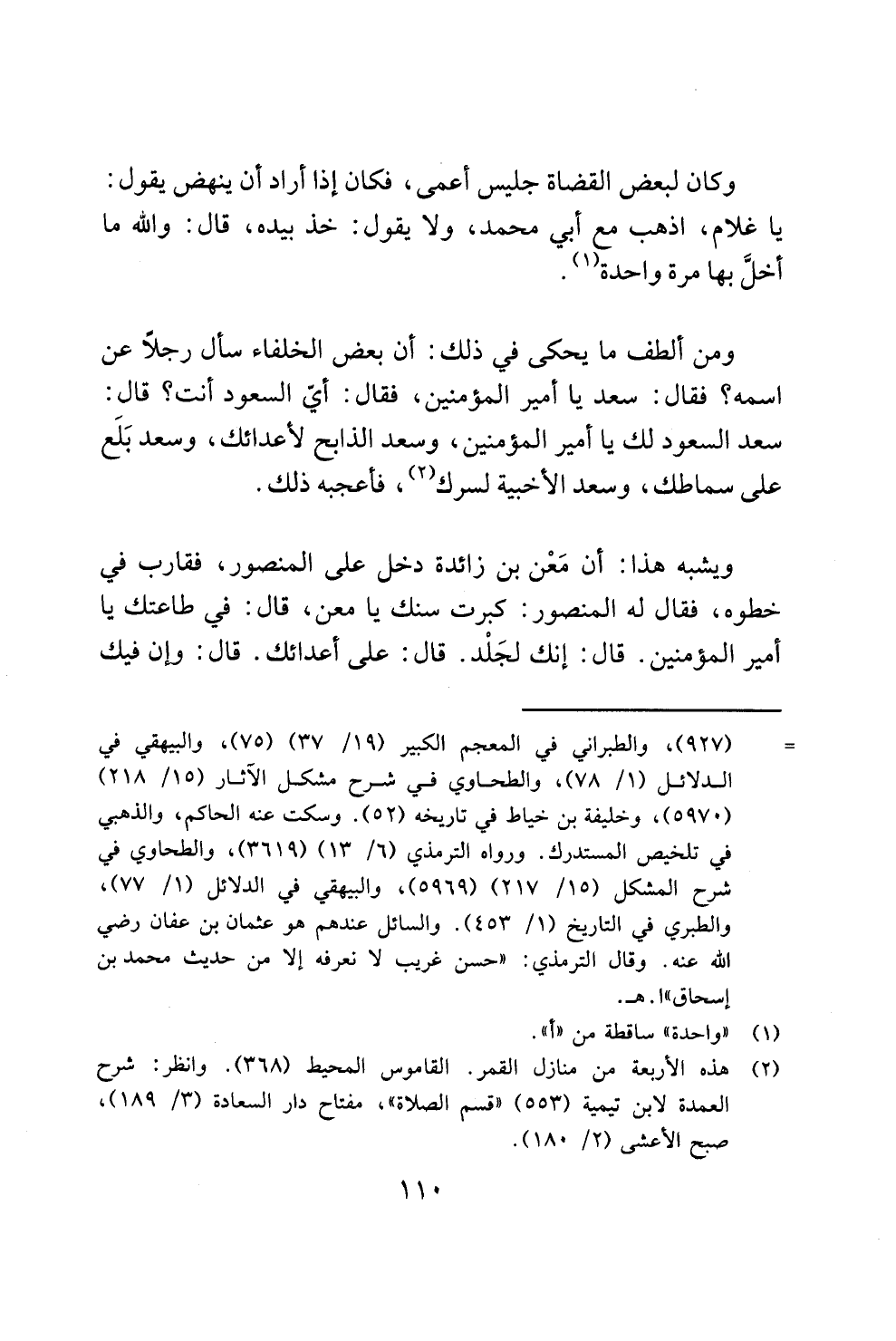 ومن ألطف ما يحكى في ذلك: أن بعض الخلفاء سأل رجلًا عن اسمه؟ فقال: سعد يا أمير المؤمنين، فقال: أيّ السعود أنت؟ قال: سعد السعود لك يا أمير المؤمنين، وسعد الذابح لأعدائك، وسعد بَلَع على سماطك، وسعد الأخبية لسرك (¬2)، فأعجبه ذلك.