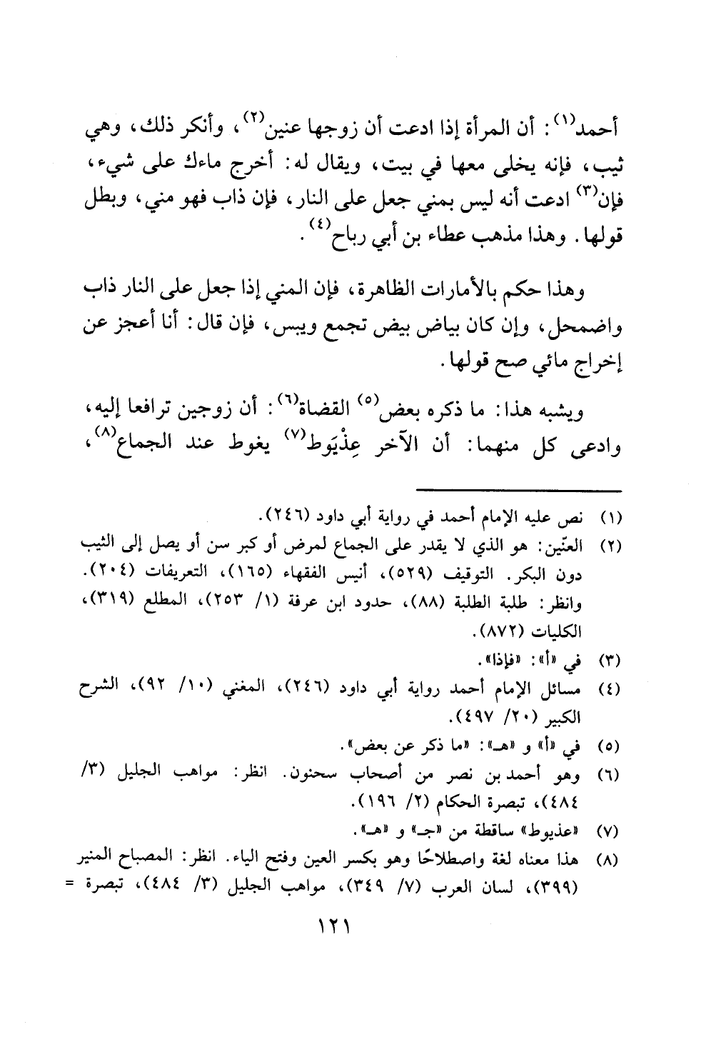 (¬2) العنّين: هو الذي لا يقدر على الجماع لمرض أو كبر سن أو يصل إلى الثيب دون البكر. التوقيف (529)، أنيس الفقهاء (165)، التعريفات (204). وانظر: طلبة الطلبة (88)، حدود ابن عرفة (1/ 253)، المطلع (319)، الكليات (872).