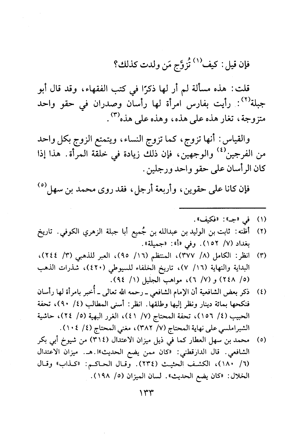 (¬4) ذكر بعض الشافعية أن الإمام الشافعي - رحمه الله تعالى - أُخبر بامرأة لها رأسان فنكحها بمائة دينار ونظر إليها وطلقها. انظر: أسنى المطالب (4/ 90)، تحفة الحبيب (4/ 156)، تحفة المحتاج (7/ 41)، الغرر البهية (5/ 24)، حاشية الشبراملسي على نهاية المحتاج (7/ 382)، مغني المحتاج (4/ 104).