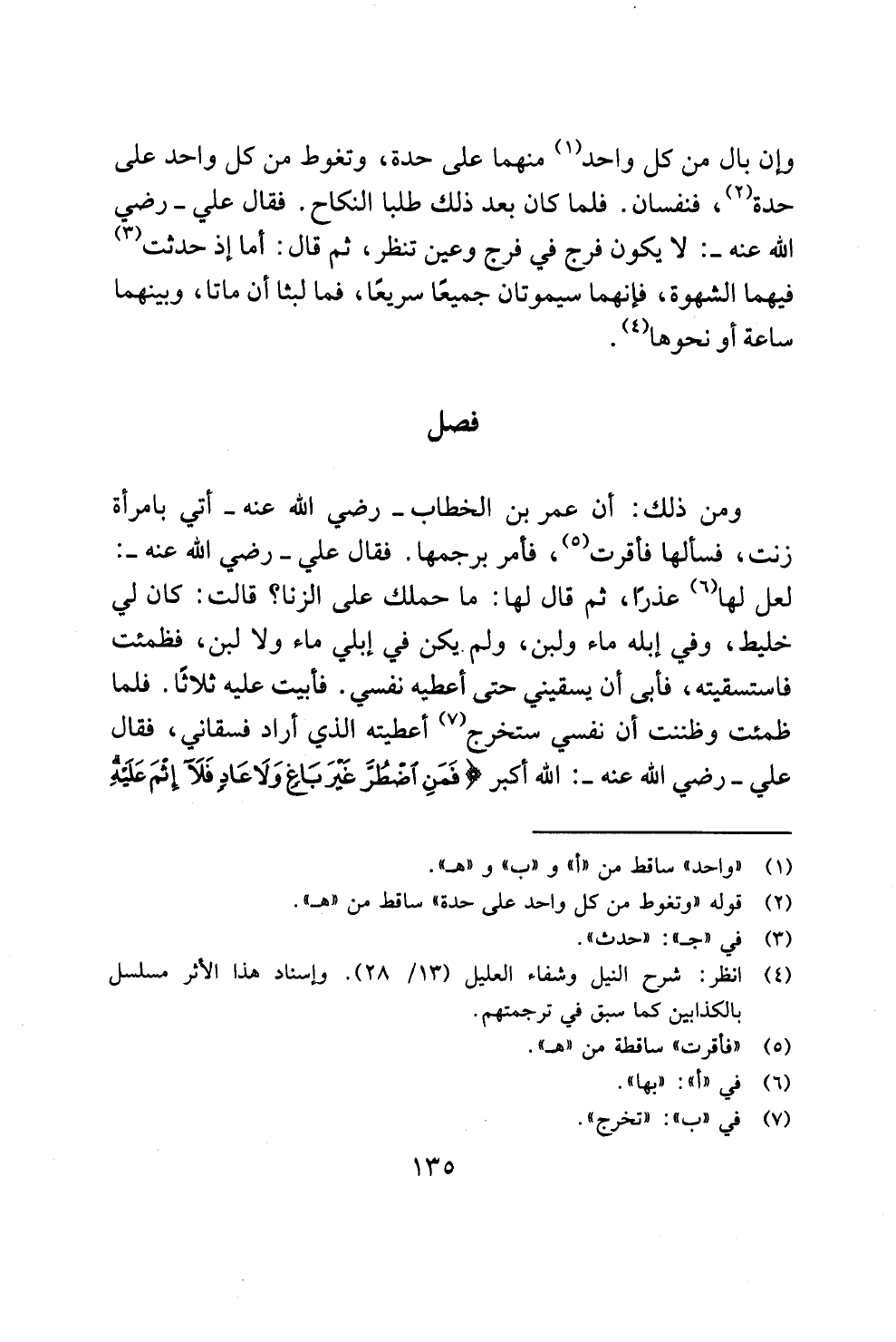 ومن ذلك: أن عمر بن الخطاب - رضي الله عنه - أتي بامرأة زنت، فسألها فأقرت (¬5)، فأمر برجمها. فقال علي - رضي الله عنه -: لعل لها (¬6) عذرًا، ثم قال لها: ما حملك على الزنا؟ قالت: كان لي خليط، وفي إبله ماء ولبن، ولم يكن في إبلي ماء ولا لبن، فظمئت فاستسقيته، فأبى أن يسقيني حتى أعطيه نفسي. فأبيت عليه ثلاثًا. فلما ظمئت وظننت أن نفسي ستخرج (¬7) أعطيته الذي أراد فسقاني، فقال علي - رضي الله عنه -: الله أكبر {فَمَنِ اضْطُرَّ غَيْرَ بَاغٍ وَلَا عَادٍ فَلَا إِثْمَ عَلَيْهِ