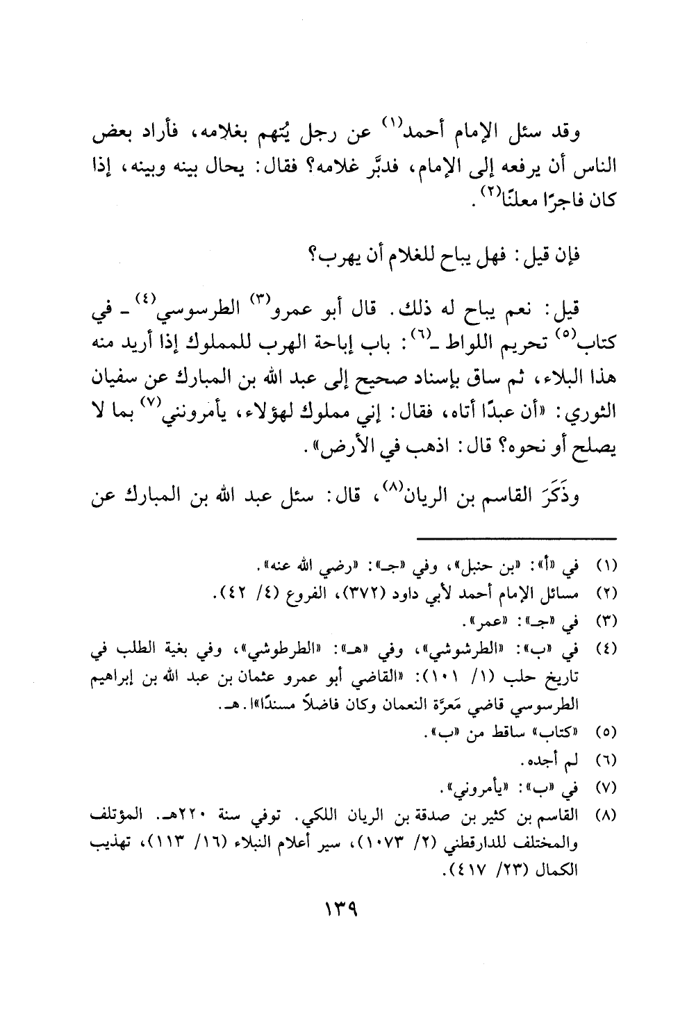 قيل: نعم يباح له ذلك. قال أبو عمرو (¬3) الطرسوسي (¬4) - في كتاب (¬5) تحريم اللواط - (¬6): باب إباحة الهرب للمملوك إذا أريد منه هذا البلاء، ثم ساق بإسناد صحيح إلى عبد الله بن المبارك عن سفيان الثوري: "أن عبدًا أتاه، فقال: إني مملوك لهؤلاء، يأمرونني (¬7) بما لا يصلح أو نحوه؟ قال: اذهب في الأرض".