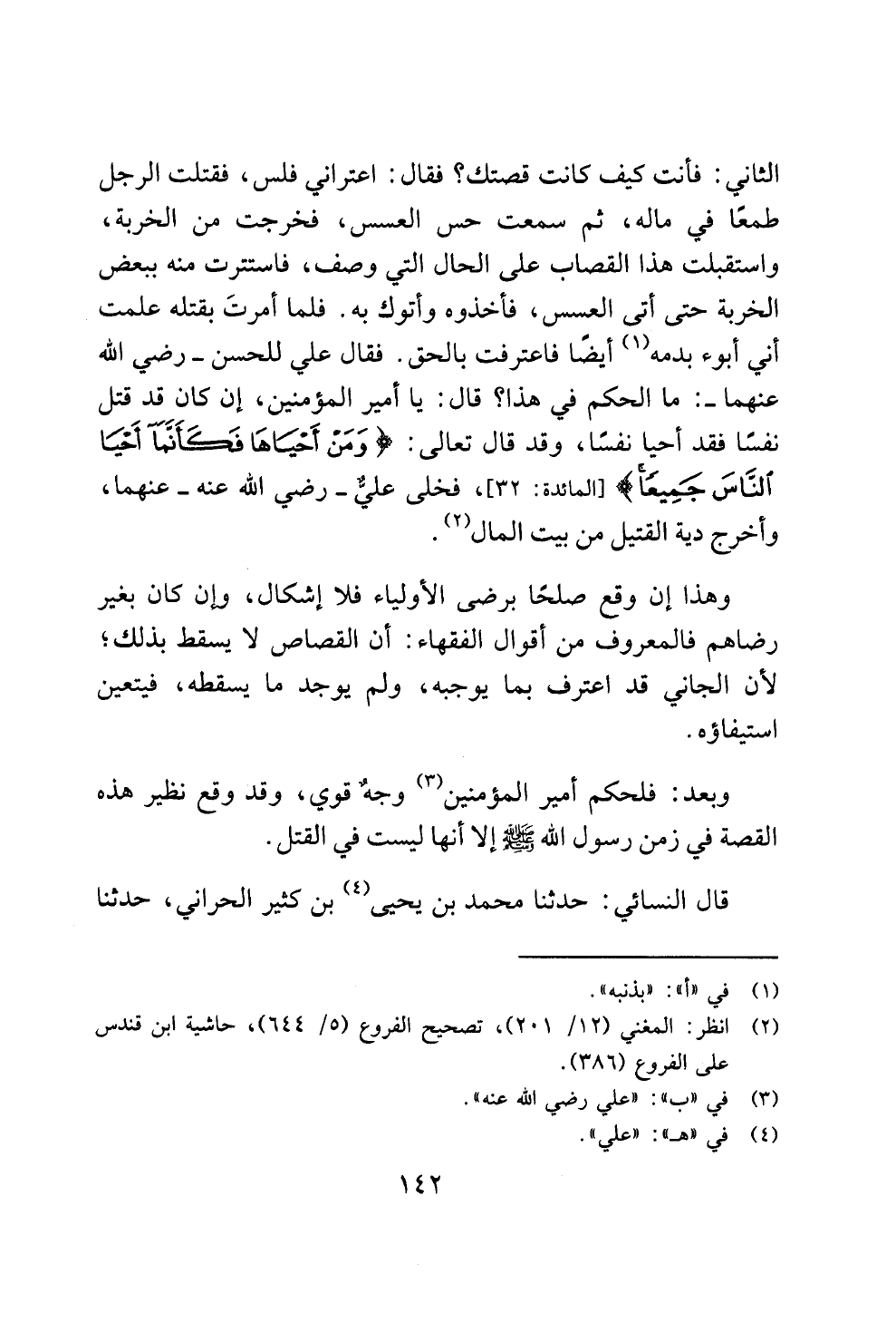 وبعد: فلحكم أمير المؤمنين (¬3) وجهٌ قوي، وقد وقع نظير هذه القصة في زمن رسول الله - صلى الله عليه وسلم - إلا أنها ليست في القتل.