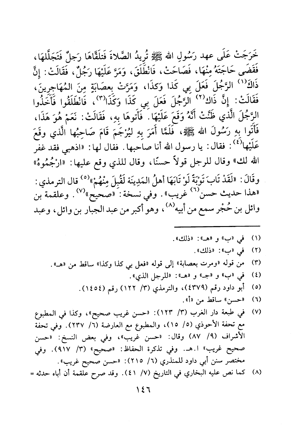 خَرَجَتْ عَلَى عهد رَسُولِ الله - صلى الله عليه وسلم - تُرِيدُ الصَّلاةَ فَتلَقَّاهَا رَجلٌ فَتَجَلَّلهَا، فَقَضَى حَاجَتَهُ مِنْهَا، فَصَاحَتْ، فَانْطَلَقَ، وَمَرَّ عَلَيْهَا رَجُلٌ، فَقَالَتْ: إِنَّ ذَاكَ (¬1) الرَّجُلَ فَعَلَ بِي كَذا وَكذَا، وَمَرَّتْ بعصَابَةٍ مِنَ المُهَاجرِينَ، فَقَالَتْ: إِنَّ ذَاك (¬2) الرَّجُلَ فَعَلَ بِي كَذَا وَكذَا (¬3)، فَانْطَلَقُوا فأَخَذُوا الرَّجُلَ الَّذي ظَنَّتْ أَنَّهُ وَقَعَ عَلَيْهَا. فَأَتوهَا بِهِ، فَقَالَتْ: نَعَمْ هُوَ هَذَا، فَأَتَوا بهِ رَسُولَ الله - صلى الله عليه وسلم -، فلَمَّا أَمَرَ بهِ ليُرْجَمَ قَامَ صَاحِبُها الَّذي وقَعَ عَلَيْها (¬4): فقال: يا رسول الله أنا صاحبها. فقال لها: "اذهبي فقد غفر الله لك" وقال للرجل قولًا حسنًا، وقال للذي وقع عليها: "ارْجُمُوهُ" وقَالَ: "لَقَدْ تَابَ تَوْبَةً لَوْ تَابَهَا أهلُ المَدِينَة لَقُبِلَ مِنْهُمْ" (¬5) قال الترمذي: "هذا حديث حسن (¬6) غريب". وفي نسخة: "صحيح" (¬7). وعلقمة بن وائل بن حُجْر سمع من أبيه (¬8)، وهو أكبر من عبد الجبار بن وائل، وعبد