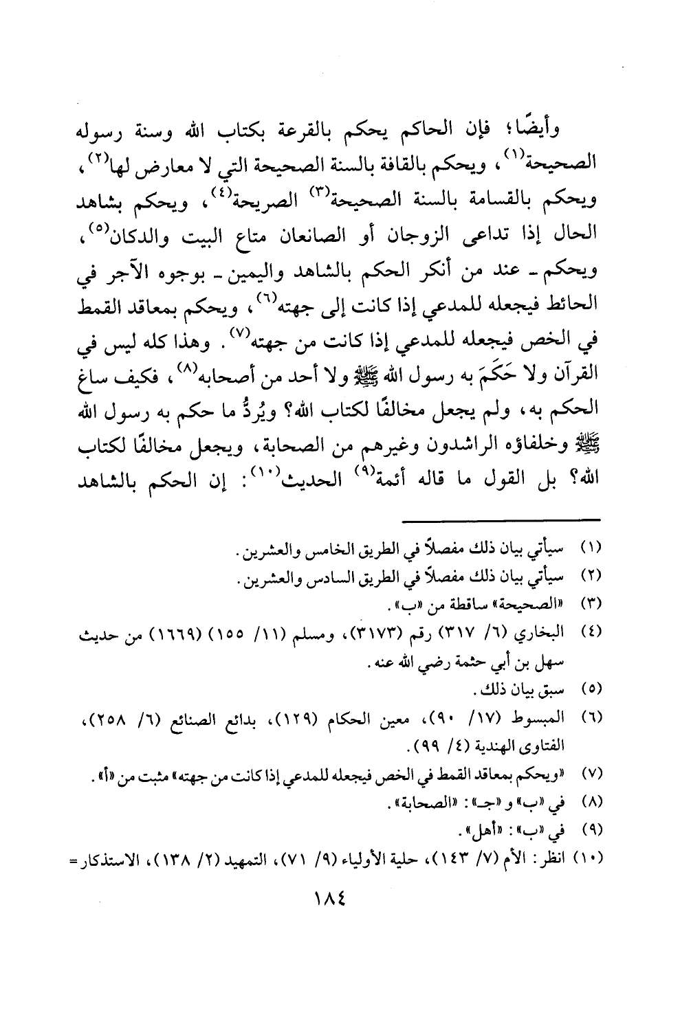 وأيضًا؛ فإن الحاكم يحكم بالقرعة بكتاب الله وسنة رسوله الصحيحة (¬1)، ويحكم بالقافة بالسنة الصحيحة التي لا معارض لها (¬2)، ويحكم بالقسامة بالسنة الصحيحة (¬3) الصريحة (¬4)، ويحكم بشاهد الحال إذا تداعى الزوجان أو الصانعان متاع البيت والدكان (¬5)، ويحكم - عند من أنكر الحكم بالشاهد واليمين - بوجوه الآجر في الحائط فيجعله للمدعي إذا كانت إلى جهته (¬6)، ويحكم بمعاقد القمط في الخص فيجعله للمدعي إذا كانت من جهته (¬7). وهذا كله ليس في القرآن ولا حَكَمَ به رسول الله - صلى الله عليه وسلم - ولا أحد من أصحابه (¬8)، فكيف ساغ الحكم به، ولم يجعل مخالفًا لكتاب الله؟ ويُردُّ ما حكم به رسول الله - صلى الله عليه وسلم - وخلفاؤه الراشدون وغيرهم من الصحابة، ويجعل مخالفًا لكتاب الله؟ بل القول ما قاله أئمة (¬9) الحديث (¬10): إن الحكم بالشاهد