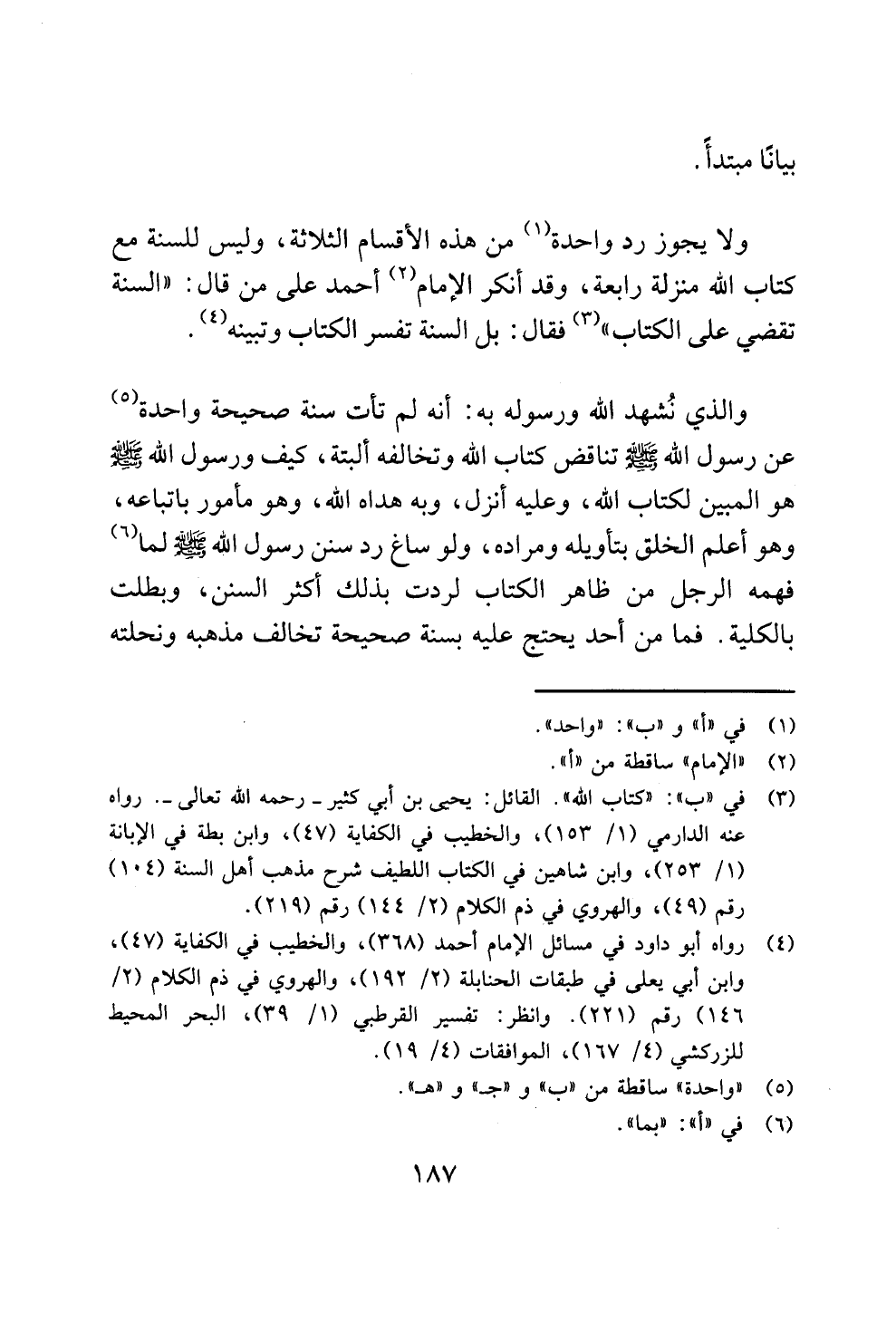 (¬4) رواه أبو داود في مسائل الإمام أحمد (368)، والخطيب في الكفاية (47)، وابن أبي يعلى في طبقات الحنابلة (2/ 192)، والهروي في ذم الكلام (2/ 146) رقم (221). وانظر: تفسير القرطبي (1/ 39)، البحر المحيط للزركشي (4/ 167)، الموافقات (4/ 19).