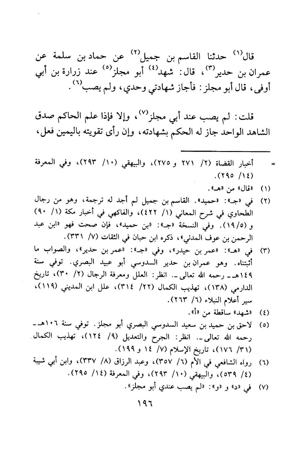 قال (¬1) حدثنا القاسم بن جميل (¬2) عن حماد بن سلمة عن عمران بن حدير (¬3)، قال: شهد (¬4) أبو مجلز (¬5) عند زرارة بن أبي أوفى، قال أبو مجلز: فأجاز شهادتي وحدي، ولم يصب (¬6).