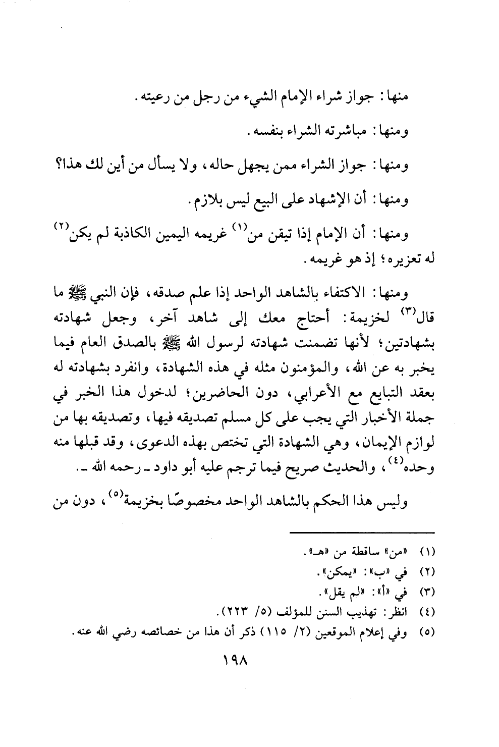 ومنها: الاكتفاء بالشاهد الواحد إذا علم صدقه، فإن النبي - صلى الله عليه وسلم - ما قال (¬3) لخزيمة: أحتاج معك إلى شاهد آخر، وجعل شهادته بشهادتين؛ لأنها تضمنت شهادته لرسول الله - صلى الله عليه وسلم - بالصدق العام فيما يخبر به عن الله، والمؤمنون مثله في هذه الشهادة، وانفرد بشهادته له بعقد التبايع مع الأعرابي، دون الحاضرين؛ لدخول هذا الخبر في جملة الأخبار التي يجب على كل مسلم تصديقه فيها، وتصديقه بها من لوازم الإيمان، وهي الشهادة التي تختص بهذه الدعوى، وقد قبلها منه وحده (¬4)، والحديث صريح فيما ترجم عليه أبو داود - رحمه الله -.