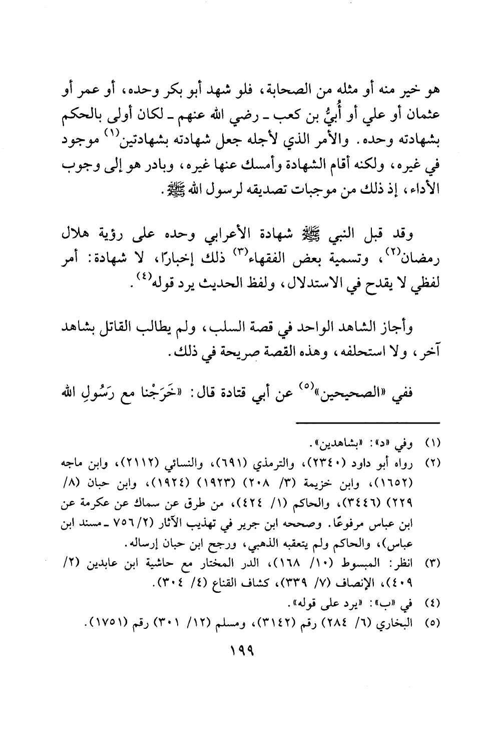 وأجاز الشاهد الواحد في قصة السلب، ولم يطالب القاتل بشاهد آخر، ولا استحلفه، وهذه القصة صريحة في ذلك.