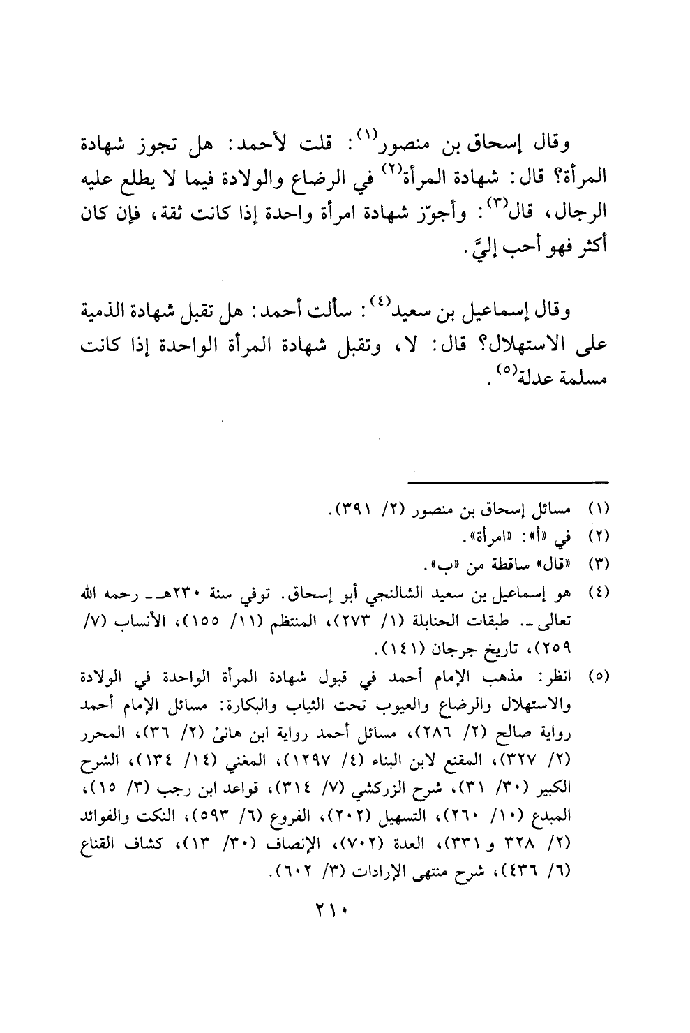 (¬5) انظر: مذهب الإمام أحمد في قبول شهادة المرأة الواحدة في الولادة والاستهلال والرضاع والعيوب تحت الثياب والبكارة: مسائل الإمام أحمد رواية صالح (2/ 286)، مسائل أحمد رواية ابن هانئ (2/ 36)، المحرر (2/ 327)، المقنع لابن البناء (4/ 1297)، المغني (14/ 134)، الشرح الكبير (30/ 31)، شرح الزركشي (7/ 314)، قواعد ابن رجب (3/ 15)، المبدع (10/ 260)، التسهيل (202)، الفروع (6/ 593)، النكت والفوائد (2/ 328 و 331)، العدة (702)، الإنصاف (30/ 13)، كشاف القناع (6/ 436)، شرح منتهى الإرادات (3/ 602).