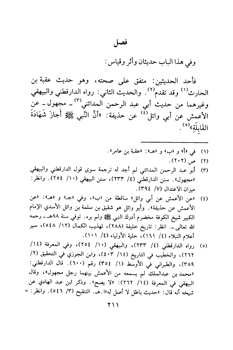 فأحد الحديثين: متفق على صحته، وهو حديث عقبة بن الحارث (¬1) وقد تقدم (¬2). والحديث الثاني: رواه الدارقطني والبيهقي وغيرهما من حديث أبي عبد الرحمن المدائني (¬3) - مجهول - عن الأعمش عن أبي وائل (¬4) عن حذيفة: "أنَّ النَّبي - صلى الله عليه وسلم - أَجازَ شَهَادَةَ القَابِلَةِ" (¬5).