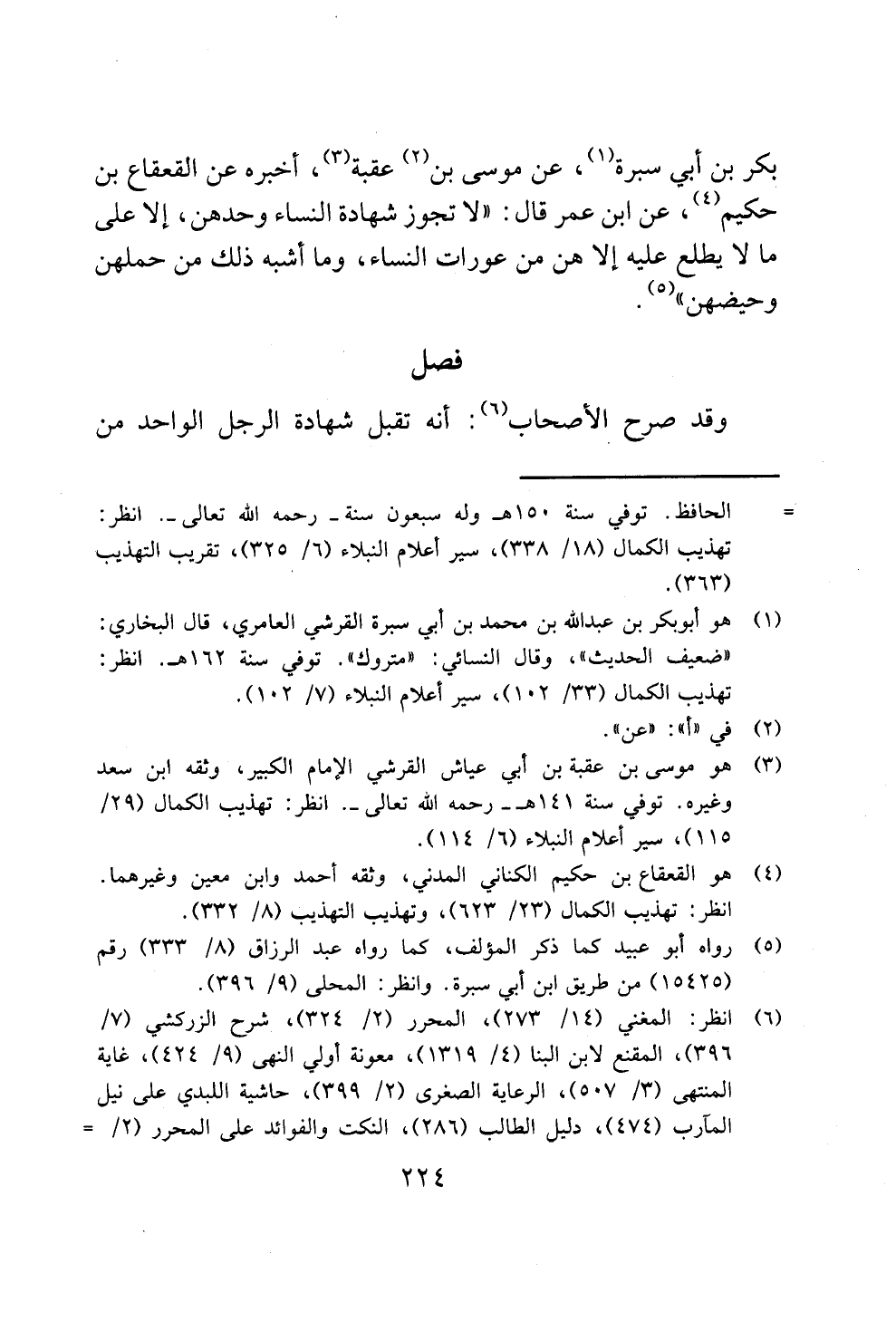 بكر بن أبي سبرة (¬1)، عن موسى بن (¬2) عقبة (¬3)، أخبره عن القعقاع بن حكيم (¬4)، عن ابن عمر قال: "لا تجوز شهادة النساء وحدهن، إلا على ما لا يطلع عليه إلا هن من عورات النساء، وما أشبه ذلك من حملهن وحيضهن" (¬5).