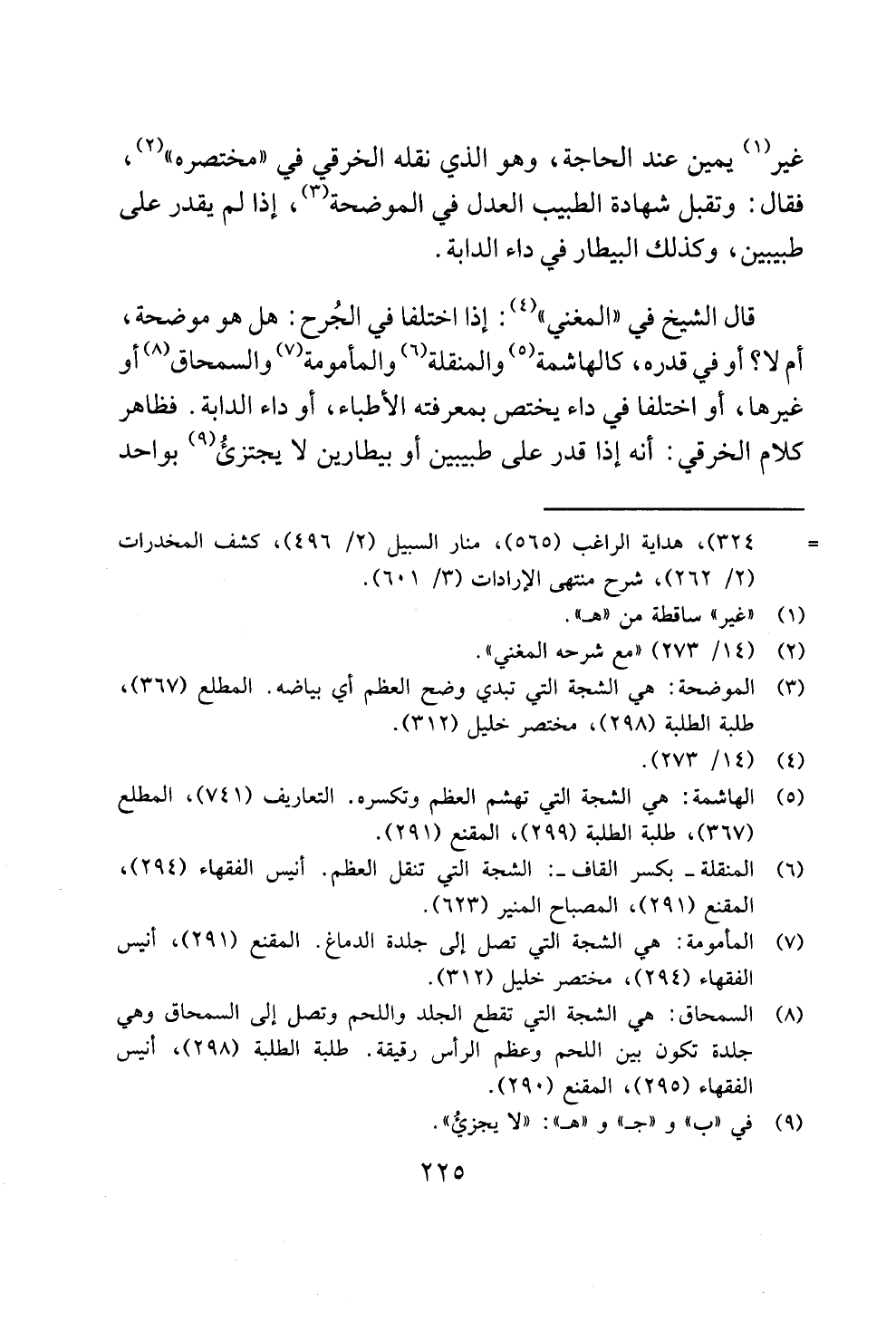 قال الشيخ في "المغني" (¬4): إذا اختلفا في الجُرح: هل هو موضحة، أم لا؟ أو في قدره، كالهاشمة (¬5) والمنقلة (¬6) والمأمومة (¬7) والسمحاق (¬8) أو غيرها، أو اختلفا في داء يختص بمعرفته الأطباء، أو داء الدابة. فظاهر كلام الخرقي: أنه إذا قدر على طبيبين أو بيطارين لا يجتزئُ (¬9) بواحد