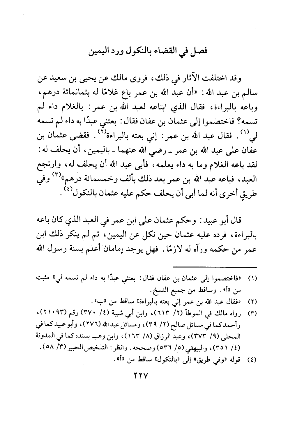 قال أبو عبيد: وحكم عثمان على ابن عمر في العبد الذي كان باعه بالبراءة، فرده عليه عثمان حين نكل عن اليمين، ثم لم ينكر ذلك ابن عمر من حكمه ورآه له لازمًا. فهل يوجد إمامان أعلم بسنة رسول الله