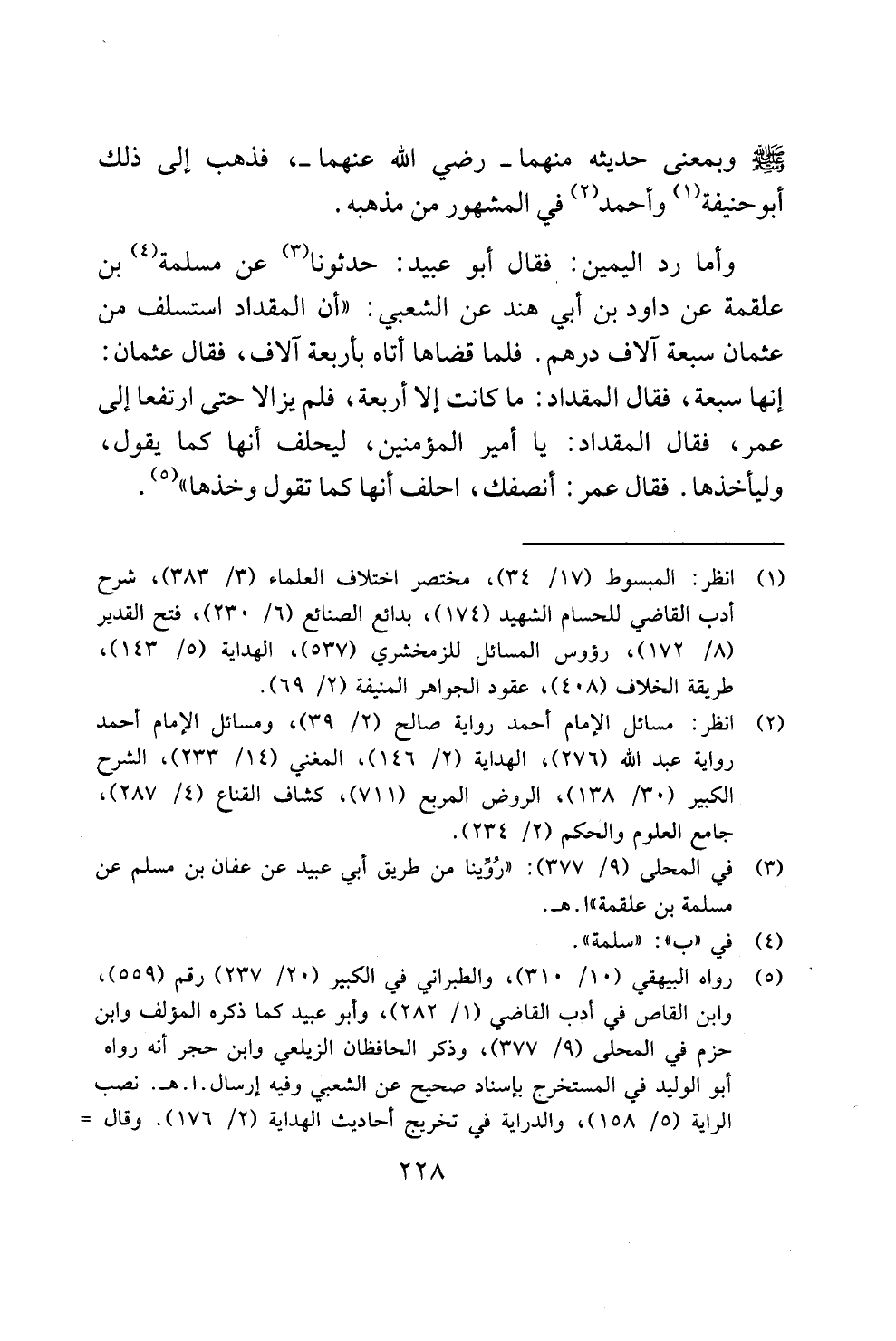 وأما رد اليمين: فقال أبو عبيد: حدثونا (¬3) عن مسلمة (¬4) بن علقمة عن داود بن أبي هند عن الشعبي: "أن المقداد استسلف من عثمان سبعة آلاف درهم. فلما قضاها أتاه بأربعة آلاف، فقال عثمان: إنها سبعة، فقال المقداد: ما كانت إلا أربعة، فلم يزالا حتى ارتفعا إلى عمر، فقال المقداد: يا أمير المؤمنين، ليحلف أنها كما يقول، وليأخذها. فقال عمر: أنصفك، احلف أنها كما تقول وخذها" (¬5).