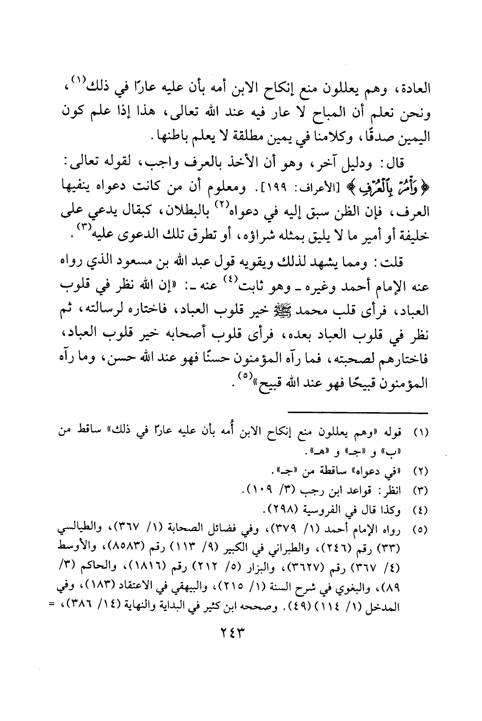 قلت: ومما يشهد لذلك ويقويه قول عبد الله بن مسعود الذي رواه عنه الإمام أحمد وغيره - وهو ثابت (¬4) عنه -: "إن الله نظر في قلوب العباد، فرأى قلب محمد - صلى الله عليه وسلم - خير قلوب العباد، فاختاره لرسالته، ثم نظر في قلوب العباد بعده، فرأى قلوب أصحابه خير قلوب العباد، فاختارهم لصحبته، فما رآه المؤمنون حسنًا فهو عند الله حسن، وما رآه المؤمنون قبيحًا فهو عند الله قبيح" (¬5).