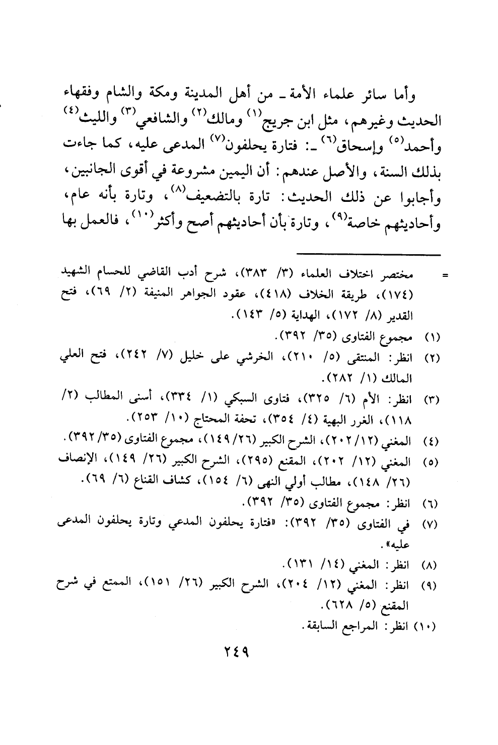 وأما سائر علماء الأمة - من أهل المدينة ومكة والشام وفقهاء الحديث وغيرهم، مثل ابن جريج (¬1) ومالك (¬2) والشافعي (¬3) والليث (¬4) وأحمد (¬5) وإسحاق (¬6) -: فتارة يحلفون (¬7) المدعى عليه، كما جاءت بذلك السنة، والأصل عندهم: أن اليمين مشروعة في أقوى الجانبين، وأجابوا عن ذلك الحديث: تارة بالتضعيف (¬8)، وتارة بأنه عام، وأحاديثهم خاصة (¬9)، وتارة بأن أحاديثهم أصح وأكثر (¬10)، فالعمل بها