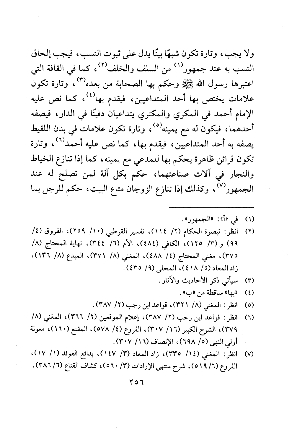 ولا يجب، وتارة تكون شبهًا بينًا يدل على ثبوت النسب، فيجب إلحاق النسب به عند جمهور (¬1) من السلف والخلف (¬2)، كما في القافة التي اعتبرها رسول الله - صلى الله عليه وسلم - وحكم بها الصحابة من بعده (¬3)، وتارة تكون علامات يختص بها أحد المتداعيين، فيقدم بها (¬4)، كما نص عليه الإمام أحمد في المكري والمكتري يتداعيان دفينًا في الدار، فيصفه أحدهما، فيكون له مع يمينه (¬5)، وتارة تكون علامات في بدن اللقيط يصفه به أحد المتداعيين، فيقدم بها، كما نص عليه أحمد (¬6)، وتارة تكون قرائن ظاهرة يحكم بها للمدعي مع يمينه، كما إذا تنازع الخياط والنجار في آلات صناعتهما، حكم بكل آلة لمن تصلح له عند الجمهور (¬7)، وكذلك إذا تنازع الزوجان متاع البيت، حكم للرجل بما