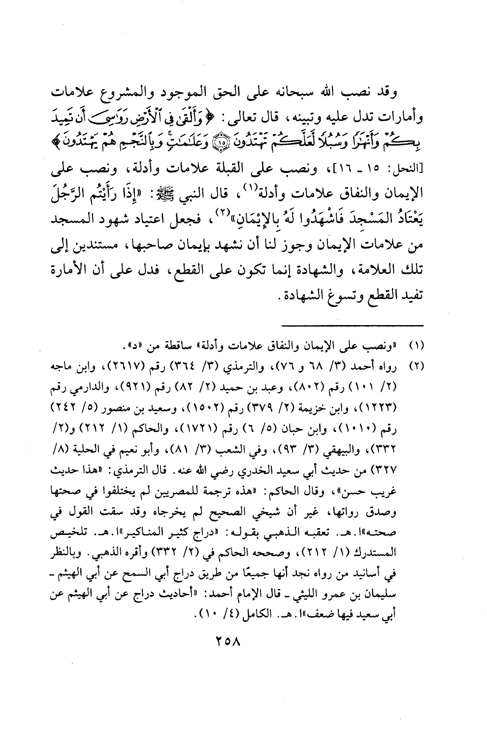 وقد نصب الله سبحانه على الحق الموجود والمشروع علامات وأمارات تدل عليه وتبينه، قال تعالى: {وَأَلْقَى فِي الْأَرْضِ رَوَاسِيَ أَنْ تَمِيدَ بِكُمْ وَأَنْهَارًا وَسُبُلًا لَعَلَّكُمْ تَهْتَدُونَ (15) وَعَلَامَاتٍ وَبِالنَّجْمِ هُمْ يَهْتَدُونَ} [النحل: 15 - 16]، ونصب على القبلة علامات وأدلة، ونصب على الإيمان والنفاق علامات وأدلة (¬1)، قال النبي - صلى الله عليه وسلم -: "إِذَا رَأَيْتُم الرَّجُلَ يَعْتَادُ المَسْجدَ فَاشْهَدُوا لَهُ بِالإِيْمَانِ" (¬2)، فجعل اعتياد شهود المسجد من علامات الإيمان وجوز لنا أن نشهد بإيمان صاحبها، مستندين إلى تلك العلامة، والشهادة إنما تكون على القطع، فدل على أن الأمارة تفيد القطع وتسوغ الشهادة.