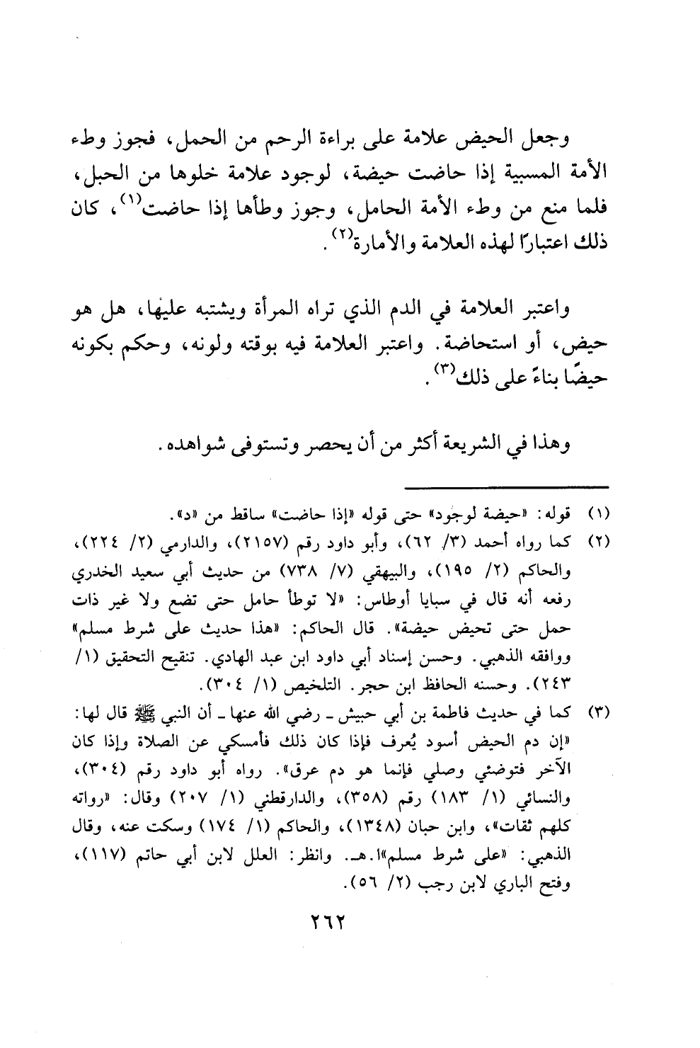 (¬3) كما في حديث فاطمة بنت أبي حبيش - رضي الله عنها - أن النبي - صلى الله عليه وسلم - قال لها: "إن دم الحيض أسود يُعرف فإذا كان ذلك فأمسكي عن الصلاة وإذا كان الآخر فتوضئي وصلي فإنما هو دم عرق". رواه أبو داود رقم (304)، والنسائي (1/ 183) رقم (358)، والدارقطني (1/ 207) وقال: "رواته كلهم ثقات"، وابن حبان (1348)، والحاكم (1/ 174) وسكت عنه، وقال الذهبي: "على شرط مسلم" ا. هـ. وانظر: العلل لابن أبي حاتم (117)، وفتح الباري لابن رجب (2/ 56).