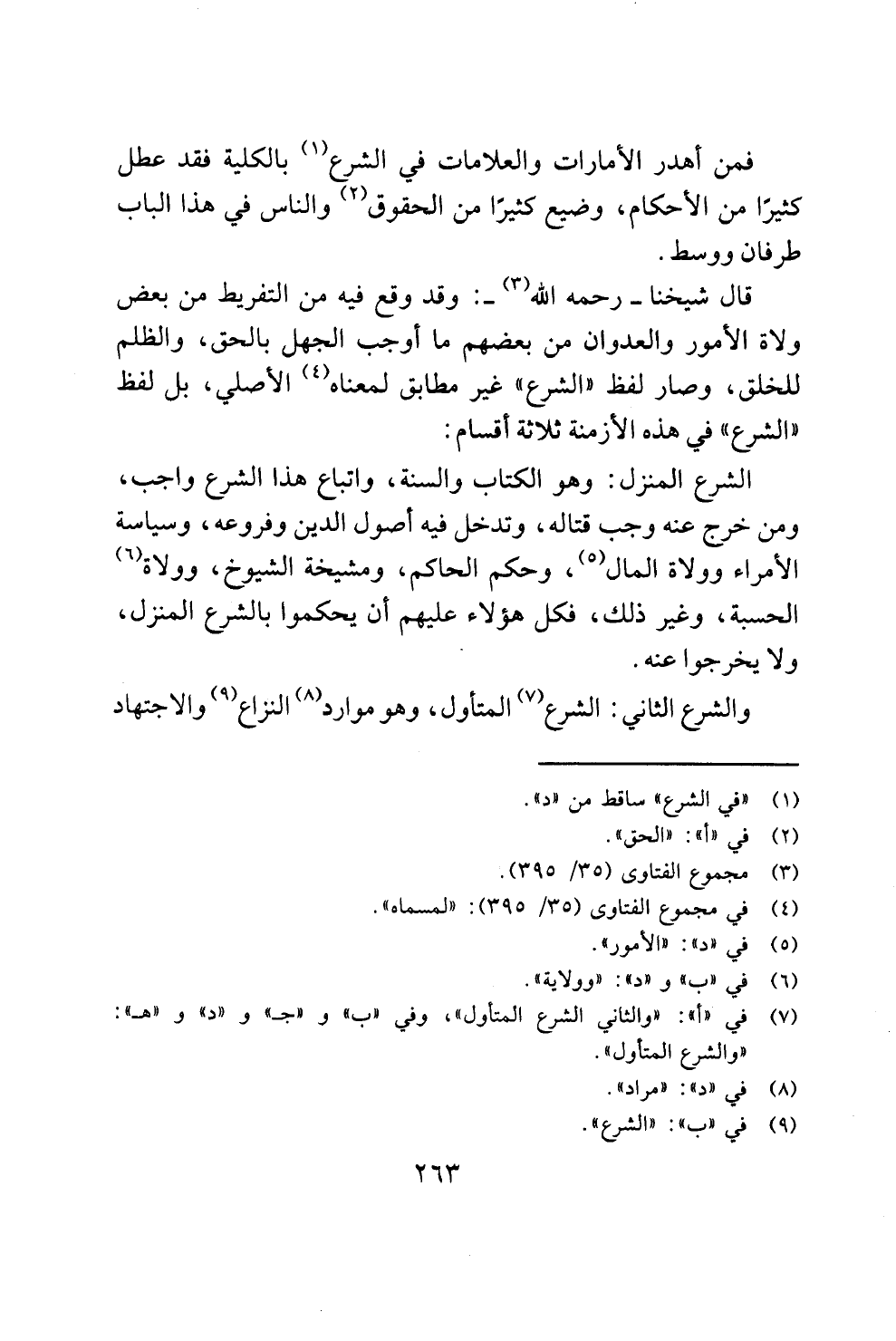 قال شيخنا - رحمه الله (¬3) -: وقد وقع فيه من التفريط من بعض ولاة الأمور والعدوان من بعضهم ما أوجب الجهل بالحق، والظلم للخلق، وصار لفظ "الشرع" غير مطابق لمعناه (¬4) الأصلي، بل لفظ "الشرع" في هذه الأزمنة ثلاثة أقسام: