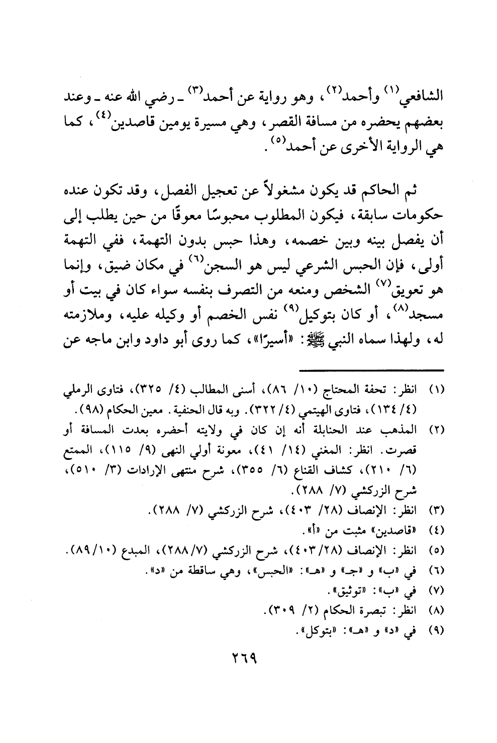 ثم الحاكم قد يكون مشغولًا عن تعجيل الفصل، وقد تكون عنده حكومات سابقة، فيكون المطلوب محبوسًا معوقًا من حين يطلب إلى أن يفصل بينه وبين خصمه، وهذا حبس بدون التهمة، ففي التهمة أولى، فإن الحبس الشرعي ليس هو السجن (¬6) في مكان ضيق، وإنما هو تعويق (¬7) الشخص ومنعه من التصرف بنفسه سواء كان في بيت أو مسجد (¬8)، أو كان بتوكيل (¬9) نفس الخصم أو وكيله عليه، وملازمته له، ولهذا سماه النبي - صلى الله عليه وسلم -: "أسيرًا"، كما روى أبو داود وابن ماجه عن