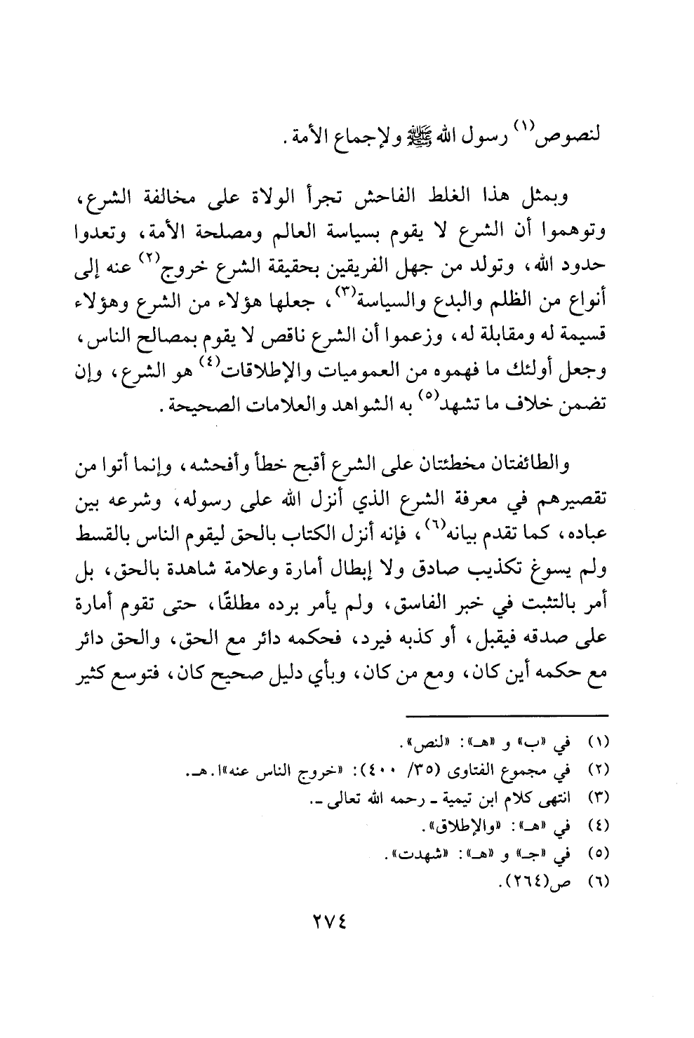 وبمثل هذا الغلط الفاحش تجرأ الولاة على مخالفة الشرع، وتوهموا أن الشرع لا يقوم بسياسة العالم ومصلحة الأمة، وتعدوا حدود الله، وتولد من جهل الفريقين بحقيقة الشرع خروج (¬2) عنه إلى أنواع من الظلم والبدع والسياسة (¬3)، جعلها هؤلاء من الشرع وهؤلاء قسيمة له ومقابلة له، وزعموا أن الشرع ناقص لا يقوم بمصالح الناس، وجعل أولئك ما فهموه من العموميات والإطلاقات (¬4) هو الشرع، وإن تضمن خلاف ما تشهد (¬5) به الشواهد والعلامات الصحيحة.