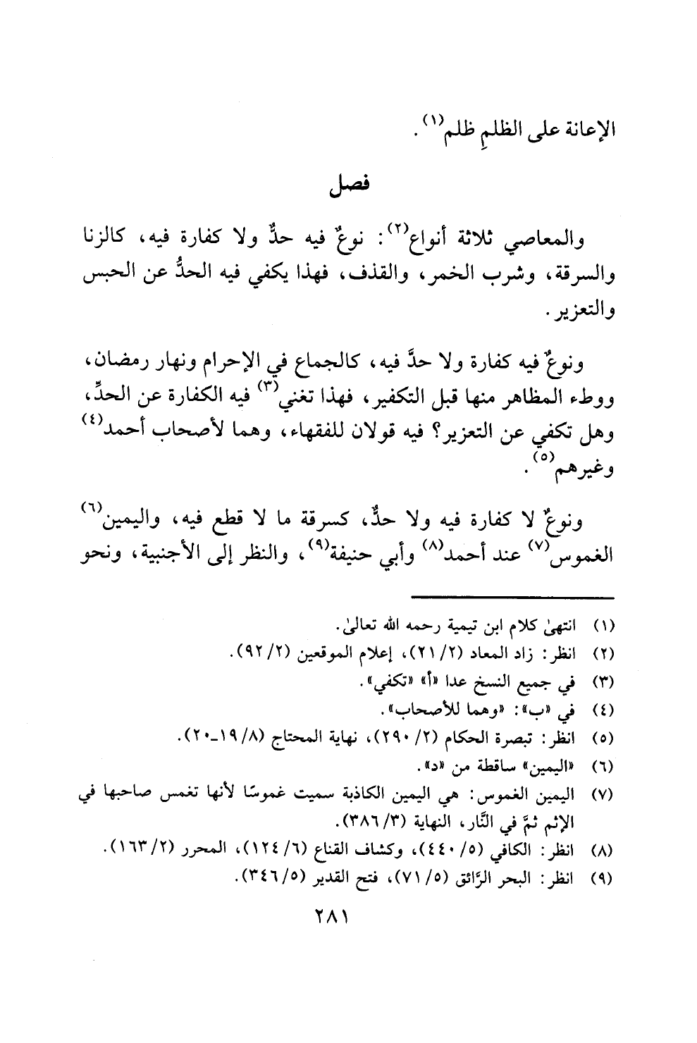 ونوعٌ فيه كفارة ولا حدَّ فيه، كالجماع في الإحرام ونهار رمضان، ووطء المظاهر منها قبل التكفير، فهذا تغني (¬3) فيه الكفارة عن الحدِّ، وهل تكفي عن التعزير؟ فيه قولان للفقهاء، وهما لأصحاب أحمد (¬4) وغيرهم (¬5).