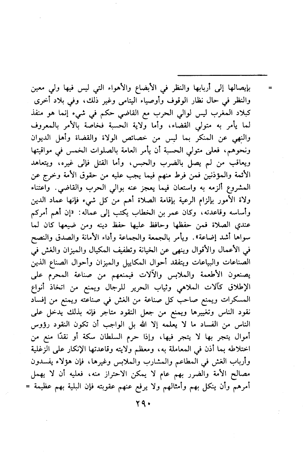 = بإيصالها إلى أربابها والنظر في الأبضاع والأهواء التي ليس فيها ولي معين والنظر في حال نظار الوقوف وأوصياء اليتامى وغير ذلك، وفي بلاد أخرى كبلاد المغرب ليس لوالي الحرب مع القاضي حكم في شيء إنما هو منفذ لما يأمر به متولي القضاء، وأما ولاية الحسبة فخاصة بالأمر بالمعروف والنهي عن المنكر بما ليس من خصائص الولاة والقضاة وأهل الديوان ونحوهم، فعلي متولي الحسبة أن يأمر العامة بالصلوات الخمس في مواقيتها ويعاقب من لم يصل بالضرب والحبس، وأما القتل فإلى غيره، ويتعاهد الأئمة والمؤذنين فمن فرط منهم فيما يجب عليه من حقوق الأمة وخرج عن المشروع ألزمه به واستعان فيما يعجز عنه بوالي الحرب والقاضي. واعتناء ولاة الأمور بإلزام الرعية بإقامة الصلاة أهم من كل شيء فإنها عماد الدين وأساسه وقاعدته، وكان عمر بن الخطاب يكتب إلى عماله: "إن أهم أمركم عندي الصلاة فمن حفظها وحافظ عليها حفظ دينه ومن ضيعها كان لما سواها أشد إضاعة". ويأمر بالجمعة والجماعة وأداء الأمانة والصدق والنصح في الأعمال والأقوال وينهى عن الخيانة وتطفيف المكيال والميزان والغش في الصناعات والبياعات ويتفقد أحوال المكاييل والميزان وأحوال الصناع الذين يصنعون الأطعمة والملابس والآلات فيمنعهم من صناعة المحرم على الإطلاق كآلات الملاهي وثياب الحرير للرجال ويمنع من اتخاذ أنواع المسكرات ويمنع صاحب كل صناعة من الغش في صناعته ويمنع من إفساد نقود الناس وتغييرها ويمنع من جعل النقود متاجر فإنه بذلك يدخل على الناس من الفساد ما لا يعلمه إلا الله بل الواجب أن تكون النقود رؤوس أموال يتجر بها لا يتجر فيها، وإذا حرم السلطان سكة أو نقدًا منع من اختلاطه بما أذن في المعاملة به، ومعظم ولايته وقاعدتها الأنكار على الزغلية وأرباب الغش في المطاعم والمشارب والملابس وغيرها، فإن هؤلاء يفسدون مصالح الأمة والضرر بهم عام لا يمكن الاحتراز منه، فعليه أن لا يهمل أمرهم وأن ينكل بهم وأمثالهم ولا يرفع عنهم عقوبته فإن البلية بهم عظيمة =