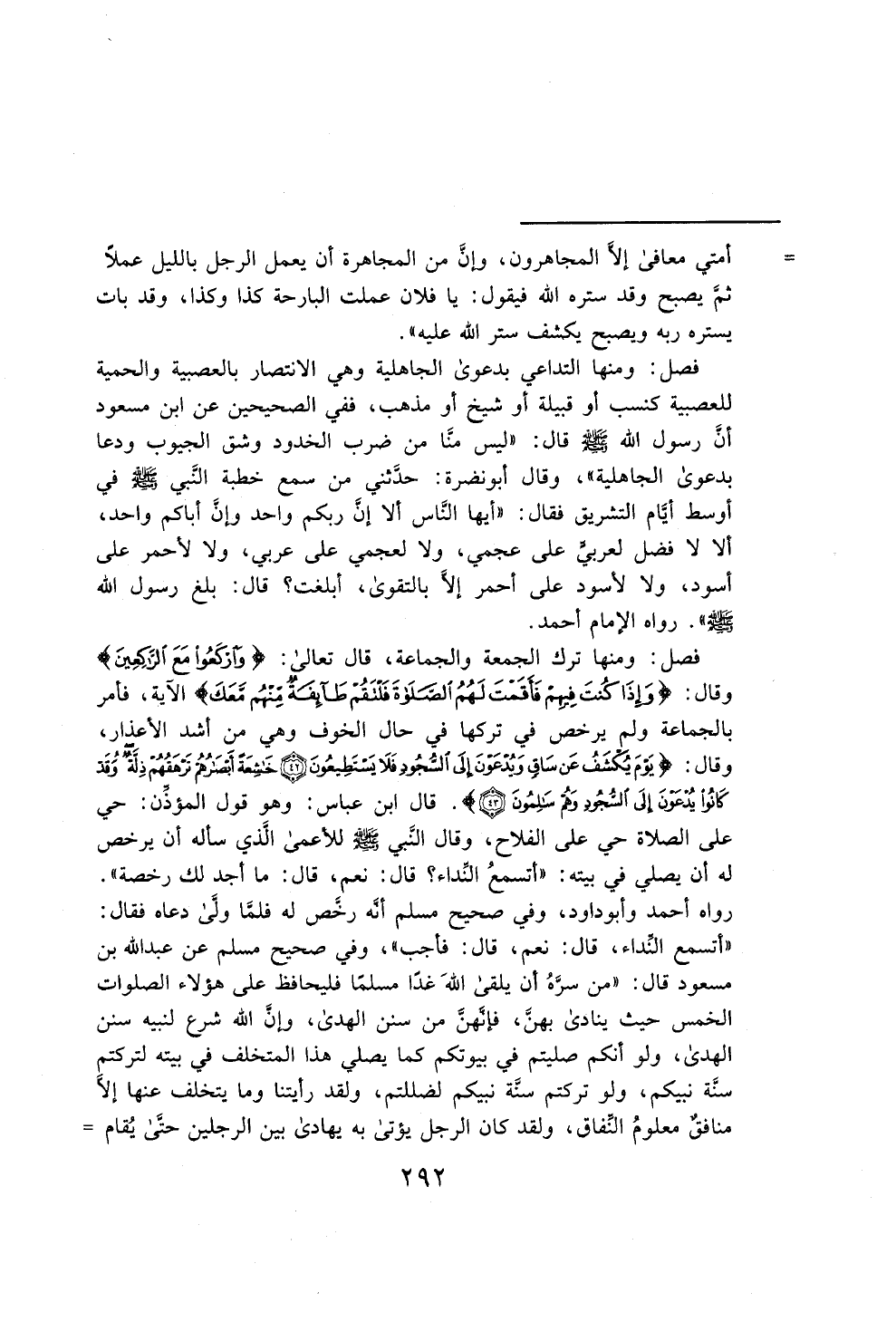 فصل: ومنها ترك الجمعة والجماعة، قال تعالى: {وَارْكَعُوا مَعَ الرَّاكِعِينَ} وقال: {وَإِذَا كُنْتَ فِيهِمْ فَأَقَمْتَ لَهُمُ الصَّلَاةَ فَلْتَقُمْ طَائِفَةٌ مِنْهُمْ مَعَكَ} الآية، فأمر بالجماعة ولم يرخص في تركها في حال الخوف وهي من أشد الأعذار، وقال: {يَوْمَ يُكْشَفُ عَنْ سَاقٍ وَيُدْعَوْنَ إِلَى السُّجُودِ فَلَا يَسْتَطِيعُونَ (42) خَاشِعَةً أَبْصَارُهُمْ تَرْهَقُهُمْ ذِلَّةٌ وَقَدْ كَانُوا يُدْعَوْنَ إِلَى السُّجُودِ وَهُمْ سَالِمُونَ (43)}. قال ابن عباس: وهو قول المؤذِّن: حي على الصلاة حي على الفلاح، وقال النَّبي - صلى الله عليه وسلم - للأعمى الَّذي سأله أن يرخص له أن يصلي في بيته: "أتسمعُ النِّداء؟ قال: نعم، قال: ما أجد لك رخصة". رواه أحمد وأبو داود، وفي صحيح مسلم أنَّه رخص له فلمَّا ولَّى دعاه فقال: "أتسمع النَّداء، قال: نعم، قال: فأجب"، وفي صحيح مسلم عن عبد الله بن مسعود قال: "من سرَّهُ أن يلقى اللهَ غدًا مسلمًا فليحافظ على هؤلاء الصلوات الخمس حيث ينادى بهنَّ، فإنَّهنَّ من سنن الهدى، وإنَّ الله شرع لنبيه سنن الهدى، ولو أنكم صليتم في بيوتكم كما يصلي هذا المتخلف في بيته لتركتم سنَّة نبيكم، ولو تركتم سنَّة نبيكم لضللتم، ولقد رأيتنا وما يتخلف عنها إلَّا منافقٌ معلومُ النِّفاق، ولقد كان الرجل يؤتى به يهادى بين الرجلين حتَّى يُقام =