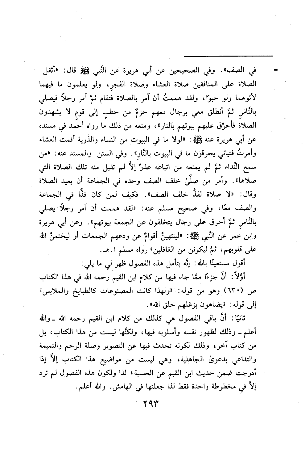 = في الصف". وفي الصحيحين عن أبي هريرة عن النَّبي - صلى الله عليه وسلم - قال: "أثقل الصلاة على المنافقين صلاة العشاء وصلاة الفجرِ، ولو يعلمون ما فيهما لأتوهما ولو حبوًا، ولقد هممتُ أن آمر بالصلاة فتقام ثمَّ آمر رجلًا فيصلي بالنَّاسِ ثمَّ أنطلق معي برجال معهم حزمٌ من حطبٍ إلى قومٍ لا يشهدون الصلاة فأحرِّق عليهم بيوتهم بالنار"، ومنعه من ذلك ما رواه أحمد في مسنده عن أبي هريرة عنه - صلى الله عليه وسلم -: "لولا ما في البيوت من النساء والذرية أقمت العشاء وأمرتُ فتياني يحرقون ما في البيوت بالنَّارِ". وفي السنن والمسند عنه: "من سمع النِّداء ثمَّ لم يمنعه من اتباعه عذرٌ إلَّا لم تقبل منه تلك الصلاة التي صلاها". وأمر من صلَّى خلف الصف وحده في الجماعة أن يعيد الصلاة وقال: "لا صلاة لفذٍّ خلف الصف". فكيف لمن كان فذًّا في الجماعة والصف معًا، وفي صحيح مسلم عنه: "لقد هممت أن آمر رجلًا يصلي بالنَّاسِ ثمَّ أحرق على رجال يتخلفون عن الجمعة بيوتهم". وعن أبي هريرة وابن عمر عن النَّبي - صلى الله عليه وسلم -: "لينتهينَّ أقوامٌ عن ودعهم الجمعات أو ليختمنَّ الله على قلوبهم، ثمَّ ليكونن من الغافلين" رواه مسلم ا. هـ.