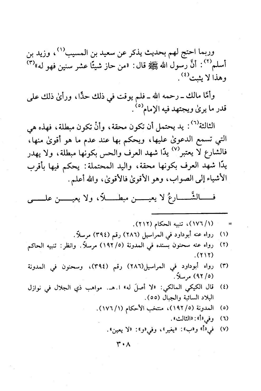وربما احتج لهم بحديث يذكر عن سعيد بن المسيب (¬1)، وزيد بن أسلم (¬2): أنَّ رسول الله - صلى الله عليه وسلم - قال: "من حاز شيئًا عشر سنين فهو له" (¬3) وهذا لا يثبت (¬4).