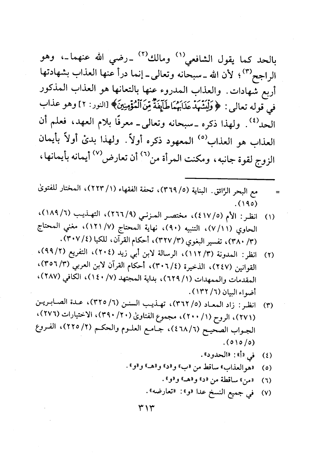 بالحد كما يقول الشافعي (¬1) ومالك (¬2) - رضي الله عنهما -، وهو الراجح (¬3)؛ لأن الله - سبحانه وتعالى - إنما درأ عنها العذاب بشهادتها أربع شهادات. والعذاب المدروء عنها بالتعانها هو العذاب المذكور في قوله تعالى: {وَلْيَشْهَدْ عَذَابَهُمَا طَائِفَةٌ مِنَ الْمُؤْمِنِينَ} [النور: 2] وهو عذاب الحد (¬4). ولهذا ذكره - سبحانه وتعالى - معرفًا بلام العهد، فعلم أن العذاب هو العذاب (¬5) المعهود ذكره أولًا. ولهذا بدئ أولًا بأيمان الزوج لقوة جانبه، ومكنت المرأة من (¬6) أن تعارض (¬7) أيمانه بأيمانها،