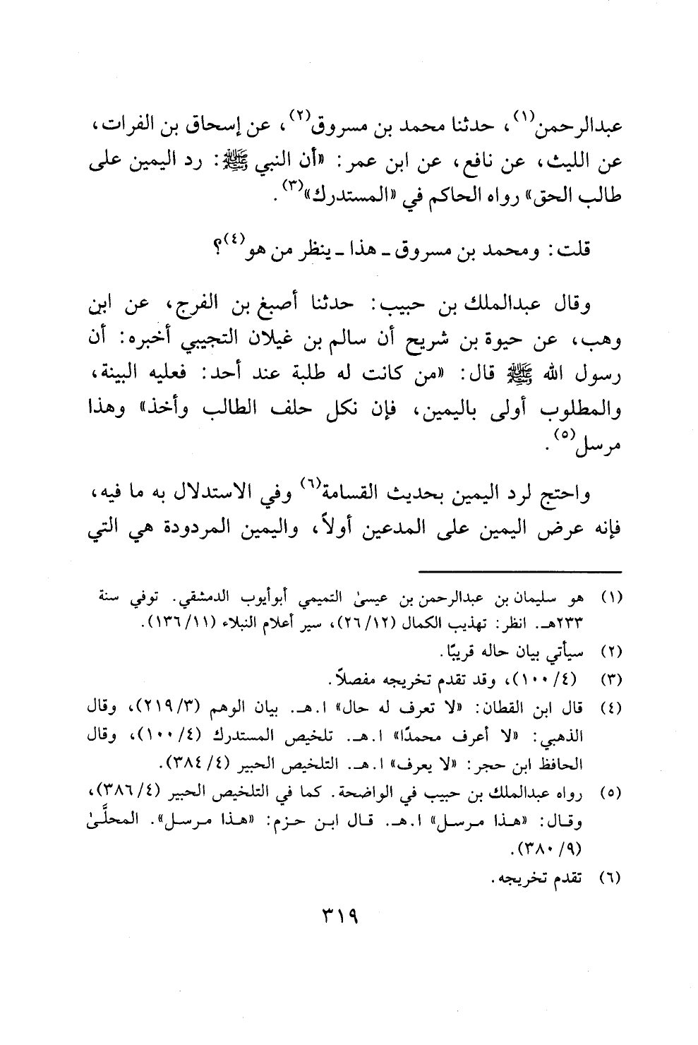 عبد الرحمن (¬1)، حدثنا محمد بن مسروق (¬2)، عن إسحاق بن الفرات، عن الليث، عن نافع، عن ابن عمر: "أن النبي - صلى الله عليه وسلم -: رد اليمين على طالب الحق" رواه الحاكم في "المستدرك" (¬3).