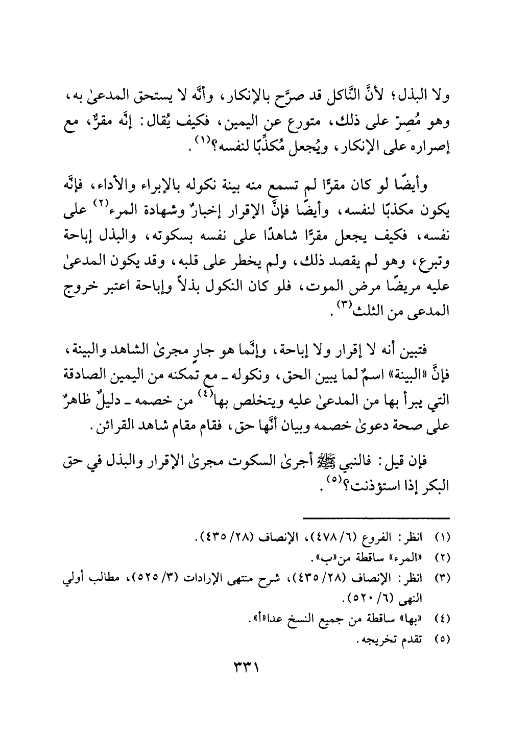 وأيضًا لو كان مقرًّا لم تسمع منه بينة نكوله بالإبراء والأداء، فإنَّه يكون مكذبًا لنفسه، وأيضًا فإنَّ الإقرار إخبارٌ وشهادة المرء (¬2) على نفسه، فكيف يجعل مقرًّا شاهدًا على نفسه بسكوته، والبذل إباحة وتبرع، وهو لم يقصد ذلك، ولم يخطر على قلبه، وقد يكون المدعى عليه مريضًا مرض الموت، فلو كان النكول بذلًا وإباحة اعتبر خروج المدعى من الثلث (¬3).