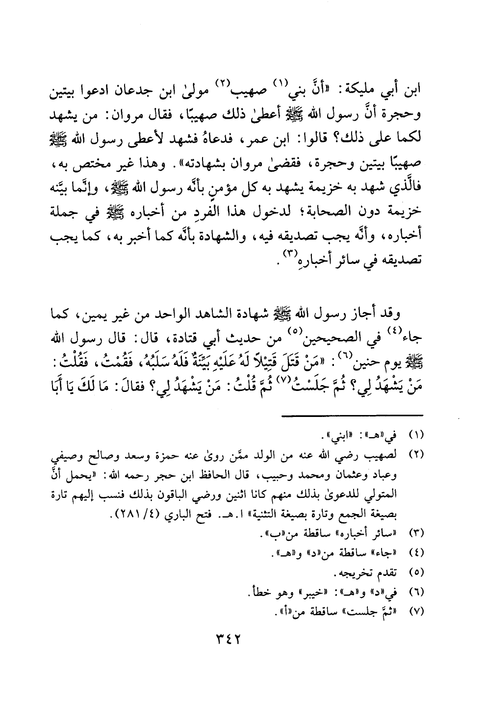ابن أبي مليكة: "أنَّ بني (¬1) صهيب (¬2) مولى ابن جدعان ادعوا بيتين وحجرة أنَّ رسول الله - صلى الله عليه وسلم - أعطى ذلك صهيبًا، فقال مروان: من يشهد لكما على ذلك؟ قالوا: ابن عمر، فدعاهُ فشهد لأعطى رسول الله - صلى الله عليه وسلم - صهيبًا بيتين وحجرة، فقضى مروان بشهادته". وهذا غير مختص به، فالَّذي شهد به خزيمة يشهد به كل مؤمنٍ بأنَّه رسول الله - صلى الله عليه وسلم -، وإنّما بيَّنه خزيمة دون الصحابة؛ لدخول هذا الفردِ من أخباره - صلى الله عليه وسلم - في جملة أخباره، وأنَّه يجب تصديقه فيه، والشهادة بأنَّه كما أخبر به، كما يجب تصديقه في سائر أخبارهِ (¬3).